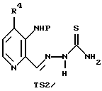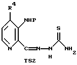 (57) Реферат: Изобретение относится к усовершенствованному способу получения соединений формулы (I), где R4 представляет Н или СН3, включающему взаимодействие соединения формулы 2-С, в котором R1 представляет группу NO2, с тиосемикарбазидом с получением тиосемикарбазона формулы ТS1, с последующим восстановлением полученного соединения. Предложен также способ получения тиосемикарбазона формулы TS2, включающий взаимодействие соединения 2-С, в котором R1 представляет группу NHP с тиосемикарбазидом. Предложены также способы получения промежуточных соединений 2-С, где R1 представляет NO2, NH2, NHP, NPP’, N3 или CO2R2, P и Р’ представляют защитные группы, R2 представляет C1-С3алкил, R4 представляет Н или СН3, и соединения формулы (4). Предлагаемые способы получения тиосемикарбазонов пиридин-2-карбоксальдегидов позволяют увеличить выход целевых продуктов до 30% из легко доступных исходных веществ. 4 н. и 17 з.п. ф-лы, 3 ил., 1 табл. ![]() ![]() ![]() ![]()