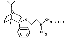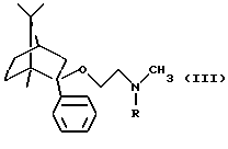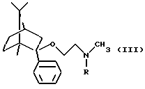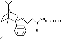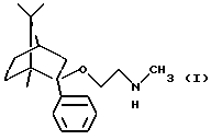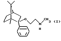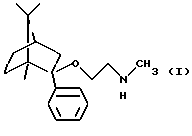 Пример 2Получение (1R, 2S,4R)-(-)-2-фенил-2-бензилметиламиноэтокси-1,7,7-триметилбицикло[2,2,1]гептана 2,0 г (8,68 моль) (-)-фенилборнеола кипятили в толуоле с 0,53 г (11 милимоль) 50%-ного гидрида натрия, затем добавляли 46,16% раствор 3,9 г (9,8 милимоль) бензилметиламиноэтилхлорида в толуоле при температуре кипения и кипятили с обратным холодильником в течение 3 часов. Реакционную смесь промывали водой, сушили и выпаривали. Кубовый остаток очищали колоночной хроматографией (элюент: гексан: этилацетат 10:1). Таким образом было получено 2,6 г нужного соединения с выходом 79,5%. Оксалат (1/1) имел температуру плавления 194-196oС (из этанола). Анализ соединения формулы: C28H37NO5 (467,59) Расчетные значения: C 71,92%; H 7,98%; N 2,99%. Определенные значения: C 72,08%; H 7,83%; N 3,08%. Получение (1R, 2S, 4R)-(-)-2-фенил-2-метиламиноэтокси-1,7,7-триметилбицикло[2,2,1]гептана 0,4 г (1,06 милимоль) (1R,2S,4R)-(-)-2-фенил-2-бензилметиламиноэтокси-1,7,7-триметилбицикло[2,2,1] гептана гидрировали в этаноле в присутствии 5%-ного катализатора палладия на угле при 60oС и давлении 10 бар в течение 6 часов. Реакционную смесь отфильтровывали, фильтрат выпаривали. Таким образом было получено 0,26 г нужного соединения в виде бесцветного масла с выходом 85,2%. Соль фумаровой кислоты получали, как описано в Примере 1. Температура плавления 2-(Е)-бутендиоата (1/1) 179-180oС (из этанола). Анализ соединения формулы: С23Н33NO5 (403,52) Расчетные значения: C 68,46%; H 8,24%; N 3,47%. Определенные значения: C 68,50%; H 8,18%; N 3,42%. Пример 3 Получение таблеток 6 весовых частей фумарата (1R,2S,4R)-(-)-2-фенил-2-метиламиноэтокси-1,7,7-триметилбицикло[2,2,1]гептана смешивали с 9 весовыми частями лактозы и 3 весовыми частями микрокристаллической целлюлозы. Полученную порошкообразную смесь гранулировали с раствором из 0,5 весовых частей поливинилпирролидона и 4 весовых частей воды, очищенной на ионообменнике, в аппаратуре для гранулирования с распылением в псевдоожиженном слое. К высушенным гранулам добавляли 1,3 весовых части карбоксиметилцеллюлозы и 0,2 весовых части стеарата магния, гранулы просеивали через 1,00 мм сито. Полученные таким образом гранулы прессовали на роторной машине для таблетирования, используя форму с диаметром 8 мм, в таблетки, имеющие среднюю массу 200 мг. Полученные таким образом таблетки массой 200 мг имели содержание активного ингредиента 60 мг. Пример 4 Получение капсул, покрытых оболочкой Гранулы, полученные, как описано в примере 3, помещали в желатиновые капсулы размером 2. Пример 5 Получение длительно растворяющихся таблеток 10 весовых частей фумарата (1R,2S,4R)-(-)-2-фенил-2-метиламиноэтокси-1,7,7-триметилбицикло[2,2,1] гептана смешивали с 9 весовыми частями гидроксипропилметилцеллюлозы (Methocel К 4М, производства Clorcon Ltd.) и 10 весовыми частями лактозы. Полученную порошкообразную смесь гранулировали с раствором из 0,4 весовых частей поливинилпирролидона и 4 весовых частей изопропанола в аппаратуре для турбулентного гранулирования. К высушенным гранулам добавляли 0,3 весовых части талька и 0,3 весовых части стеарата магния, гранулы просеивали через 1,00 мм сито. Полученные таким образом гранулы прессовали в таблетки массой 300 мг, имеющие содержание активного ингредиента 100 мг, на роторной машине для таблетирования, используя форму в виде чечевицы с диаметром 10 мм. Пример 6 Получение суппозиториев 7 весовых частей фумарата (1R,2S,4R)-(-)-2-фенил-2-метиламиноэтокси-1,7,7-триметилбицикло[2,2,1] гептана диспергировали с 53 
