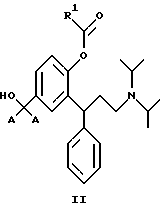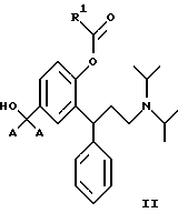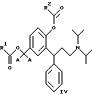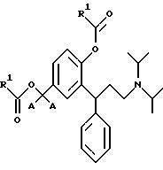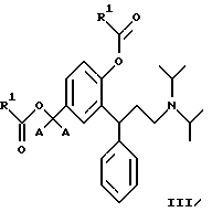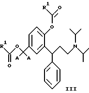5. 3,3-Дифенилпропиламины по п.2, выбранные из идентичных сложных диэфиров, представленных общей формулой III![]() где R1 является таким, как определено в п.3. 6. 3,3-Дифенилпропиламины по п.5, выбранные из: 2-(3-диизопропиламино-1-фенилпропил)-4-формилоксиметилфенилового эфира ( )-муравьиной кислоты,4-ацетокси-3-(3-диизопропиламино-1-фенилпропил)-бензилового эфира ( )-уксусной кислоты,2-(3-диизопропиламино-1-фенилпропил)-4-пропионилоксиметилфенилового эфира ( )-пропионовой кислоты,4-н-бутирилоксиметил-2-(3-диизопропиламино-1-фенилпропил)-фенилового эфира ( )-н-масляной кислоты,2-(3-диизопропиламино-1-фенилпропил)-4-изобутирилоксиметилфенилового эфира ( )-изомасляной кислоты,3-(3-диизопропиламино-1-фенилпропил)-4-(2,2-диметил-пропионилокси)-бензилового эфира ( )-2,2-диметилпропионовой кислоты,4-бензоилоксиметил-2-(3-диизопропиламино-1-фенилпропил)-фенилового эфира ( )-бензойной кислоты,4-бензоилоксиметил-2-(3-диизопропиламино-1-фенилпропил)-фенилового эфира (R)-(+)-бензойной кислоты. 7. 3,3-Дифенилпропиламины по п.2, выбранные из смешанных сложных диэфиров, представленных общей формулой IV ![]() где R1 является таким, как определено в п.3; R2 представляет собой водород, С1-С6алкил или фенил, при условии, что R1 и R2 не идентичны. 8. 3,3-Дифенилпропиламины по п.7, выбранные из: 2-(3-диизопропиламино-1-фенилпропил)-4-формилоксиметилфенилового эфира ( )-уксусной кислоты,2-(3-диизопропиламино-1-фенилпропил)-4-формилоксиметилфенилового эфира ( )-бензойной кислоты,2-(3-диизопропиламино-1-фенилпропил)-4-ацетоксиметилфенилового эфира ( )-бензойной кислоты,2-(3-диизопропиламино-1-фенилпропил)-4-ацетоксиметилфенилового эфира (R)-(+)-бензойной кислоты, 4-ацетоксиметил-2-(3-диизопропиламино-1-фенилпропил)-фенилового эфира ( )-изомасляной кислоты,4-ацетоксиметил-2-(3-диизопропиламино-1-фенилпропил)-фенилового эфира (R)-(+)-изомасляной кислоты, 4-ацетокси-3-(3-диизопропиламино-1-фенилпропил)-бензилового эфира ( )-2,2-диметилпропионовой кислоты,4-ацетоксиметил-2-(3-диизопропиламино-1-фенилпропил)-фенилового эфира ( )-2,2-диметилпропионовой кислоты.