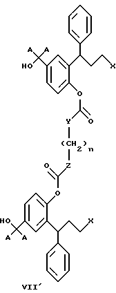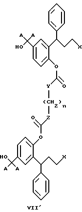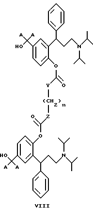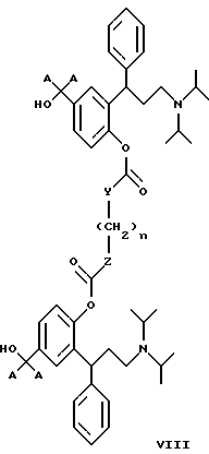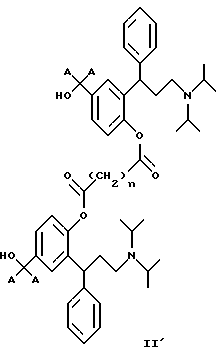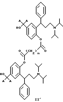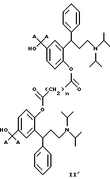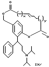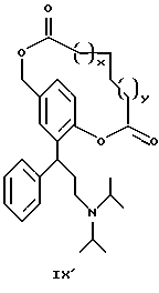 15. 3,3-Дифенилпропиламины, выбранные из:1) соединений формул IХ и IX’ ![]() ![]() где x и y являются одинаковыми или разными и обозначают количество метиленовых единиц -(СН2)- и могут изменяться в пределах от 0 до 6, 2) 2-(3-диизопропиламино-1-фенилпропил)-4-сульфооксиметилфенилового эфира ( )-бензойной кислоты,3) поли-со-CL-лактидов 2-(3-диизопропиламинофенилпропил)-4-гидроксиметилфенола, 4)( )-2-(3-диизопропиламино-1-фенилпропил)-4-(1 -D-глюкуронозилоксиметил)-фенола, имеющего формулу![]() и их соли с физиологически приемлемыми кислотами, и, если соединения могут находиться в форме оптических изомеров, рацемическая смесь и индивидуальные энантиомеры. 16. 3,3-Дифенилпропиламин по п.15, выбранный из: циклического окт-4-ен-1,8-диоата промежуточного соединения Б и циклического октан-1,8-диоата промежуточного соединения Б, имеющего формулу ![]() где А является таким, как определено в п.1. 17. 3,3-Дифенилпропиламин, представляющий собой 2-(3-диизопропиламино-1-фенилпропил)-4-(пент-4-еноилоксиметил)-фениловый эфир ( )-пент-4-еновой кислоты.