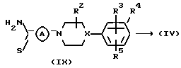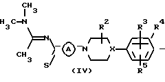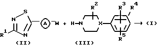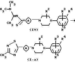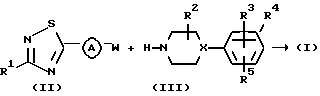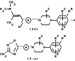 Наиболее предпочтительны:1-[4-(3-метил-1,2,4-тиадиазол-5-ил)фенил]-4-[3-(трифторметил)фенил]пиперазин и 1-[5-(3-метил-1, 2, 4-тиадиазол-5-ил)-2-пиридинил]-4-[3- (трифторметил)фенил] пиперазин и их фармацевтически приемлемые кислотно-аддитивные соли, стереоизомерные формы или N-оксиды. Соединения по настоящему изобретению могут быть в общем случае получены взаимодействием промежуточного соединения формулы (II) с промежуточным соединением формулы (III) ![]() В предшествующей и последующих реакционных схемах W представляет подходящую реакционноспособную удаляемую группу, такую как, например, галоген, например фтор, хлор, бром, йод, или в некоторых случаях W может быть также сульфонилоксигруппой, например метансульфонилокси, бензолсульфонилокси, трифторметансульфонилокси и тому подобной реакционноспособной удаляемой группой. Указанное взаимодействие проводят в соответствии с известными в данной области способами, такими как, например, перемешивание обоих реагентов в реакционно-инертном растворителе, например N,N-диметилформамиде, ацетонитриле, метилизобутилкетоне и т. п., предпочтительно в присутствии основания, например гидрокарбоната натрия, карбоната натрия или триэтиламина. Взаимодействие может быть удобно осуществлено при температуре в диапазоне от комнатной температуры до температуры кипения реакционной смеси с обратным холодильником. Соединения формулы (I), в которых R1 представляет СН3, причем эти соединения, представленные формулой (I-а), могут быть также получены обработкой промежуточного соединения формулы (IV) с гидроксиламино-О-сульфоновой кислотой в реакционно-инертном растворителе, таком как, например, метанол или этанол, в присутствии основания, такого как, например, пиридин. ![]() Соединения формулы (I) могут быть кроме этого получены преобразованием соединений формулы (I) друг в друга согласно известным в данной области реакциям преобразования групп. Соединения формулы (I) также могут быть превращены в соответствующие N-оксидные формы в соответствии с известными в данной области способами превращения трехвалентного азота в его N-оксидную форму. Указанные реакции N-окисления можно, в общем случае, проводить взаимодействием исходного вещества формулы (I) с подходящим органическим или неорганическим пероксидом. Подходящие неорганические пероксиды включают, например, пероксид водорода, пероксиды щелочного или щелочноземельного металла, например пероксид натрия, пероксид калия; подходящие органические пероксиды могут включать пероксикислоты, такие как, например, бензолкарбопероксикислота, или галогензамещенные бензолкарбопероксикислоты, например 3-хлорбензолкарбопероксикислота, пероксиалкановые кислоты, например пероксиуксусная кислота, алкилгидроксипероксиды, например трет-бутилгидропероксид. Подходящие растворители представляют собой, например, воду, низшие алканолы, например этанол и т.п., углеводороды, например толуол, кетоны, например, 2-бутанон, галогенированные углеводороды, например дихлорметан и смеси таких растворителей. Исходные вещества и некоторые промежуточные соединения представляют собой известные соединения и коммерчески доступны или могут быть получены согласно обычным способам проведения реакции, в общем случае известным в данной области техники. Например, некоторые промежуточные соединения 