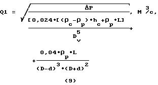 (57) Реферат: Изобретение относится к бурению скважин, в частности к способам цементирования обсадных колонн. Обеспечивает повышение качества цементирования и предотвращение аварий. Сущность изобретения: рассчитывают минимальную величину объемного расхода закачки цементного раствора по аналитическому выражению. По аналитическому выражению рассчитывают интенсивность перетока. Выбирают объемный расход закачки цементного раствора в обсадную колонну больше величины интенсивности перетока. Закачивают цементный раствор в обсадную колонну. Сбрасывают разделительную пробку. Закачивают промывочную жидкость. Продавливают цементный раствор в затрубное пространство. 3 ил. Изобретение относится к области бурения скважин, в частности к способам цементирования обсадных колонн. Известен способ цементирования обсадных колонн, включающий спуск и цементирование обсадной колонны, при этом задаются значения скоростей подъема цементного раствора в затрубное пространство, а объемный расход закачки продавочной жидкости определяют с учетом заданных величин скоростей подъема цементного раствора в кольцевом пространстве /1/. Однако данный способ не учитывает возможность разрыва столба цементного раствора в процессе его закачки и, как следствие этого, самопроизвольного увеличения объемного расхода при движении столба цементного раствора в обсадной колонне, что может привести к разрыву столба цементного раствора, а следовательно, к некачественному цементированию. Наиболее близким по технической сущности и достигаемому результату является способ цементирования обсадной колонны, включающий спуск обсадной колонны, закачивание цементного раствора в обсадную колонну, сброс разделительной пробки, закачивание промывочной жидкости и продавливание цементного раствора в затрубное пространство /2/. Однако известный способ не предотвращает возможность разрыва столба цементного раствора в процессе его закачивания в обсадную колонну, а также самопроизвольное увеличение объемного расхода закачки цементного раствора в обсадную колонну, что приводит к некачественному цементированию и авариям. Целью настоящего изобретения является повышение качества цементажа и предотвращение аварий при их выполнении путем предотвращения разрывов столба цементного раствора под действием гидростатического давления в процессе закачки цементного раствора в обсадную колонну на основе математического описания физического процесса перетока цементного раствора в затрубное пространство под действием перепада давления и количественной оценки интенсивности этого перетока, которая, в свою очередь, определяет необходимую величину объемного расхода закачки цементного раствора при цементаже. Поставленная цель достигается тем, что в известном способе цементирования обсадных колонн, включающем спуск обсадной колонны, закачку цементного раствора в обсадную колонну, сброс разделительной пробки, закачку промывочной жидкости и продавливание цементного раствора в затрубное пространство, согласно изобретению перед процессом закачки цементного раствора рассчитывают минимальную величину объемного расхода закачки цементного раствора в обсадную колонну, которую определяют из выражения: ![]() где c, p – плотность цементного и бурового раствора, кг/м3,hс