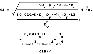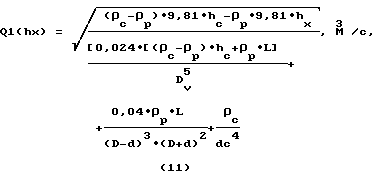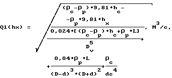 Исходя из этого, задаваясь давлением ![]() P, из формулы (4) определим объемный расход закачки цементного раствора:![]() Переходя к нашим условиям задачи, имеем: величина суммарных гидросопротивлений ![]() P приравнивается к перепаду давления , который возникает из-за разницы плотностей растворов в трубном и затрубном пространствах. Потери давления (гидросопротивления) в трубах определяются следующим образом:![]() где ср – средняя плотность жидкости в трубах, кг/м3![]() где hc – высота столба цементного раствора в трубах, м. Подставляя ср из формулы (6) в (5) и сокращая L, получаем:![]() Для затрубного пространства: ![]() – при условии, что цементный раствор не вышел в затрубное пространство. Перепад давления будет равен гидросопротивлениям: P = Pt+ Pz![]() Отсюда находим интенсивность перетока (обозначив ее Q1) при известном перепаде P.