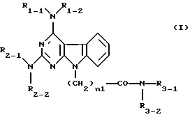 (57) Реферат: Изобретение относится к новым пиримидо[4,5-b]индолам общей формулы (I) или их фармацевтически приемлемым солям, которые могут быть использованы при лечении и/или профилактике астмы, а также к промежуточным соединениям для их получения. Указанные соединения являются нетоксичными соединениями. В пиримидо[4,5-b]индолах общей формулы (I) R1-1 и R1-2 вместе с присоединенным к ним атомом азота образуют 1-пирролидинил, R2-1 и R2-2 вместе с присоединенным к ним атомом азота образуют 1-пирролидинил, n число от 1 до 3, R3-1 означает Н и R3-2 означает (1) -Н, (2) -(СН2)-(2-пиридил), (3) -(СН2)-(3-пиридил), (4) -(СН2)-(4-пиридил), (5) -(СН2)-[СН(ОН)]4-CH2OH, (6) СН2СН2СН2СН2 ОН, или R3-1 и R3-2 вместе с присоединенным к ним атомом азота образуют гетероциклическое кольцо, выбранное из (1) 1-пирролидинила, (2) 1-пиперидинила, (3) 4-морфолинила, (4) 2-гидрокси-1-пирролидинила, (5) 3-гидрокси-1-пирролидинила, (6) 1-пролинила. 3 с. и 8 з.п.ф-лы, 3 табл.