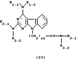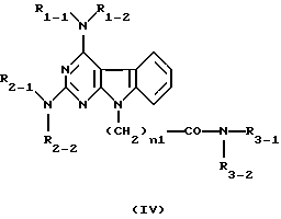 ![]() где R1-1 и R1-2 вместе с присоединенным к ним атомом азота образуют 1-пирролидинил, R2-1 и R2-2 вместе с присоединенным к ним атомом азота образуют 1-пирролидинил; n число от 1 до 3; R3-1 означает Н и R3-2 означает (1) -Н, (2) (СН2)-(2-пиридил), (3) (СН2)-(3-пиридил), (4) (СН2)-(4-пиридил), (5) (СН2)-[СН(ОН)] 4-СН2OН, (6) CН2СН2СН2СН2OН, или R3-1 и R3-2 вместе с присоединенным к ним атомом азота образуют гетероциклическое кольцо, выбранное из (1) 1-пирролидинила, (2) 1-пиперидинила, (3) 4-морфолинила, (4) 2-гидрокси-1-пирролидинила, (5) 3-гидрокси-1-пирролидинила, (6) 1-пролинила, и их фармацевтически приемлемые соли. 2. Трициклические амины формулы (IV) по п. 1, где n равно 1. 3. Трициклические амины формулы (IV) по п. 1, где R3-1 представляет -Н, и R3-2 выбран из группы, состоящей из (1) -Н, (2) -СН2-[2-пиридинил] , (3) -СН2-[СН(ОН)] 4-СН2-ОН, (4) -ОН, (5) -СН2-СН2-СН2-СН2-ОН, и где R3-1 и R3-2 вместе с присоединенным к ним атомом азота образуют гетероциклическое кольцо, выбранное из группы, состоящей из (1) 1-пирролидинила, (2) 1-пиперидинила, (3) 4-морфолинила, (4) 2-гидрокси-1-пирролидинила, (5) 3-гидрокси-1-пирролидинила, (6) 1-пролинила. 4. Трициклические амины формулы (IV) по п. 1, где R3-1 и R3-2 взяты вместе с присоединенными атомами азота с образованием 1-пирролидинила. 5. Трициклические амины формулы (IV) по п. 4, где фармацевтически приемлемые соли выбирают из группы, состоящей из гидрохлорида, сульфата, метансульфоната, малеата и фосфата. 6. Трициклические амины формулы (IV) по п. 1, которые выбраны из группы, состоящей из пирролидинамида (2,4-ди-1-пирролидинил-9Н-пиримидо[4,5-b] индол-9-ил)уксусной кислоты, морфолинамида (2,4-ди-1-пирролидинил-9Н-пиримидо[4,5-b] индол-9-ил)уксусной кислоты, 2-аминометилпиридинамида (2,4-ди-1-пирролидинил-9Н-пиримидо[4,5-b] индол-9-ил)уксусной кислоты, амида (2,4-ди-1-пирролидинил-9Н-пиримидо[4,5-b] индол-9-ил)уксусной кислоты, 1-амино-1-деоксисорбитамида(2,4-ди-1-пирролидинил-9Н-пиримидо[4,5-b] индол-9-ил)уксусной кислоты, пролинамида (2,4-ди-1-пирролидинил-9Н-пиримидо[4,5-b] -индол-9-ил)уксусной кислоты, глицинамида (2,4-ди-1-пирролидинил-9Н-пиримидо[4,5-b] индол-9-ил)уксусной кислоты, гидроксиламинамида (2,4-ди-1-пирролидинил-9Н-пиримидо-[4,5-b] индол-9-ил)уксусной кислоты, 3-гидроксипирролидинамида (2,4-ди-1-пирролидинил-9Н-пиримидо[4,5-b] индол-9-ил)уксусной кислоты, 4-амино-1-бутаноламида (2,4-ди-1-пирролидинил-9Н-пиримидо[4,5-b] индол-9-ил)уксусной кислоты, 4-аминобутановой кислоты амида(2,4-ди-1-пирролидинил-9Н-пиримидо[4,5-b] индол-9-ил)уксусной кислоты, 2-гидроксипирролидинамида (2,4-ди-1-пирролидинил-9Н-пиримидо[4,5-b] индол-9-ил)уксусной кислоты. 7. Трициклические амины формулы (IV) по п. 6, которые представляют собой пирролидинамид (2,4-ди-1-пирролидинил-9Н-пиримидо[4,5-b] индол-9-ил)уксусной кислоты. 8. Трициклические амины формулы (IV) по п. 6, которые представляют собой моногидрохлорид пирролидинамида (2,4-ди-1-пирролидинил-9Н-пиримидо[4,5-b] индол-9-ил)уксусной кислоты, сульфат пирролидинамида (2,4-ди-1-пирролидинил-9Н-пиримидо[4,5-b] индол-9-ил)уксусной кислоты, метансульфонатную соль пирролидинамида (2,4-ди-1-пирролидинил-9Н-пиримидо[4,5-b] индол-9-ил)уксусной кислоты, малеатную соль пирролидинамида (2,4-ди-1-пирролидинил-9Н-пиримидо[4,5-b] индол-9-ил)уксусной кислоты и фосфатную соль пирролидинамида (2,4-ди-1-пирролидинил-9Н-пиримидо[4,5-b] индол-9-ил)уксусной кислоты. 9. Промежуточное соединение для получения соединения по п. 1, представляющее собой трет-бутиловый эфир (2,4-ди-1-пирролидинил-9Н-пиримидо[4,5-b] индол-9-ил)уксусной кисло