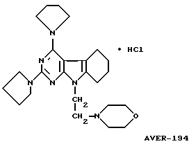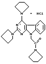 При использовании растворимости твердого вещества в растворителе, соотношение твердого вещества к растворителю представлено как вес/объем (вес/об. )ПРИМЕРЫ Без дополнительной детализации предполагается, что специалист в данной области может, используя предшествующее описание, воплотить на практике изобретение во всей его полноте. Следующие подробные примеры описывают получение различных соединений и/или осуществление различных способов по изобретению, предназначены, главным образом, для иллюстрации и не ограничивают каким-либо образом предшествующее описание. Специалисты в данной области точно идентифицируют соответствующие изменения в способах, как в отношении реагентов, так и условий и способов проведения реакций. ПРИМЕР 1. 9-[2-(Метансульфонилокси)этил]-2,4-ди-1-пирролидинил -9Н-пиримидо[4,5-b]индол (II) 9-[2-(Гидрокси)этил-2,4-ди-2-пирролидинил-9Н-пиримидо-[4,5-b] индол (I, J. Med. Chem., 38, 4161-3 (1995)) подвергают взаимодействию с метансульфонилхлоридом способами, известными специалистам, получая указанное в заголовке соединение. ПРИМЕР 2. Моногидрохлорид 1-[(2,4-ди-1-пирролидинил-9Н-пиримидо [4,5-b] индол-9-ил)ацетил] пирролидина, также известный как моногидрохлорид пирролидинамида (2,4-ди-1-пирролидинил-9Н-пиримидо-[4,5-b] индол-9-ил)уксусной кислоты (IV/V). Перемешиваемую смесь 9-[2-(метансульфонилокси)этил] -2,4-ди-1-пирролидинил-9Н-пиримидо[4,5-b] индола (II, пример 1 и WO 96/26941-А1, 165 г), цианида натрия (180 г), воды (360 мл) и ДМСО (3000 мл) нагревают при 100oС в течение 18 часов. Важно, чтобы исходный мезилат содержал следовое количество триэтиламина, или оставшееся при его получении, или же специально добавленное. Смесь охлаждают до 20-25oС, разбавляют водой (приблизительно 6000 мл) и фильтруют. Твердый продукт промывают водой для удаления избытка цианида, затем растирают с ацетоном. В результате фильтрования и высушивания получают 2,4-ди-1-пирролидинил-9Н-пиримидо[4,5-b] индол (III), т. пл. = 209-211o; ЯМР (СDСl3) 7,88, 7,22, 7,09, 3,95, 3,67 и 1,98 ; MC (m/z, FAB, M+H) 308.