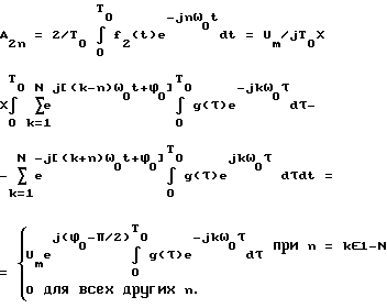 Таким образом, использование испытательного сигнала![]() измерением амплитуд и фаз входного испытательного сигнала, а также амплитуд и фаз выходных сигналов образцового и измерительного каналов и разности их выходных напряжений позволяет определять частотные характеристики названных каналов, а также степень их отличия. Сокращение объема измерительных процедур при определении АЧХ образцового и измеряемого канала, а также при определении степени неидентичности АЧХ названных каналов создает основу для повышения точности определения АЧХ измерительных каналов информационно-измерительных систем. Однако реализация требуемых измерительных процедур требует воздействия на входе испытательного сигнала ![]() т. е. суммирования гармонических колебаний равных амплитуд, вырабатываемых N генераторами, с определенным начальным углом фазового сдвига. Стабилизация амплитуд и начальных фаз N генераторов гармонических колебаний требует 2N систем автоматического регулирования и технически труднореализуема. Однако известное соотношение (Двайт Г.В. Таблицы интегралов и других математические формулы. – М.: Наука, 1966, с. 82) ![]() применительно к анализируемому испытательному сигналу f1(t) позволяет изменить характер преобразований при формировании последнего. Действительно, представление испытательного сигнала ![]() в виде ![]() позволяет трактовать его как амплитудно-модулированное (АМ) колебание, т. к. формально АМ колебание представляет произведение огибающей Um(t) и гармонического заполнения. В испытательном сигнале f1(t) функцию гармонического заполнения (т.е. колебание несущей частоты) выполняет колебание sin где – частота повторения испытательного сигнала f1(t). Функцию огибающей Um(t) выполняет периодическое колебание представляющее отношение мгновенных значений синусоидальных колебаний с кратностью частот N, равной числу суммируемых для получения испытательного сигнала гармонических колебаний кратных частот и равных амплитуд. Такое представление испытательного сигнала позволяет для его формирования использовать не N генераторов колебаний кратных частот, а всего лишь один с частотой колебаний н = (N+1) 0/2, стабильность параметров колебаний которого можно обеспечить известными методами.