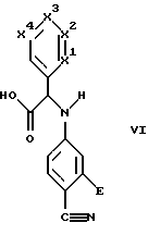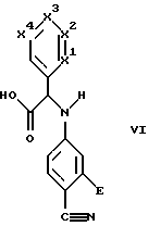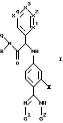 (57) Реферат: Изобретение относится к производным N-(4-карбамимидофенил) глицинамида формулы (I), где Е обозначает водород или ОН, Q обозначает водород или алкил, R обозначает арил, циклоалкил или алкил, замещенный радикалами R1, R2, R3, R1 обозначает водород, СООН, СОО-алкил или арил, R2 обозначает водород, арил, циклоалкил или гетероарил, R3 обозначает водород, арил или ОН (в положении, отличном от -положения по отношению к атому азота, к которому присоединена алкильная группа R), или необязательно замещенную аминогруппу, три из радикалов X1-X4 обозначают группу C(Ra), C(Rb) или C(Rc), а четвертый обозначает С(Rd), Ra-Rd обозначают Н, ОН, NO2, диалкиламиногруппу, галоген, алкил, алкокси, арилокси, аралкилокси, гетероарилалкилокси, гетероциклилалкилоксигруппу, СООН, СОО-алкил, NH-SO2-алкил, NH-SO2-арил, две соседние группы Ra-Rb обозначают алкилендиоксигруппу, G1 и G2 обозначают водород, ОН, также изобретение относится к промежуточным соединениям формулы (IV), (V), (VI), которые используются в способах получения соединений формулы (I), и заключаются во взаимодействии альдегида формулы (II) с изонитрилом формулы R1NC и аминобензамидином формулы (III), а также цианогруппу CN, в нитриле формулы (IV) превращают в амидиногруппу C(N-G1)NH-G2. Кроме этого, соединения формулы (I) обладают ингибирующей амидолитической активностью в отношении комплекса фактор VIIа/тканевой фактор и благодаря этому свойству могут быть действующим веществом в фармкомпозиции. 5 с. и 7 з.п.ф-лы.