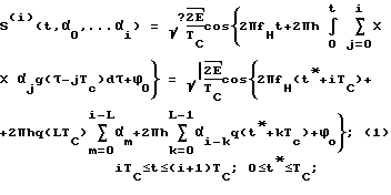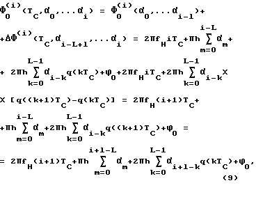 С помощью дешифратора 2 текущей фазы определяют значения фазы (i)(nTB, 0,… i) формируемого сигнала для N моментов времени, следующих друг за другом через тактовый интервал времени ТB в пределах длительности ТC информационного символа. При этом значение (3) любой n-ой выборки (n = 1,… N-1, N) фазы i-го символа (1) однозначно задается совокупностью значений L последних информационных символов ( i-L+l,… i), значением (i)0( 0,… i-l) начальной фазы в начале этого символа (при t* = 0, n* = 0) и значением n* двоичного сигнала, определяющего номер n данного отсчета.