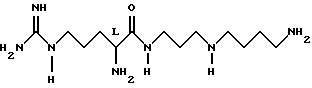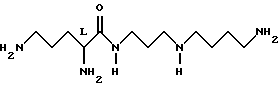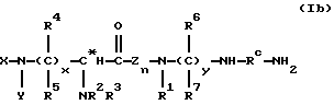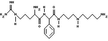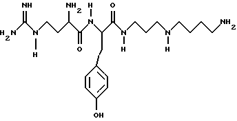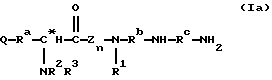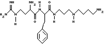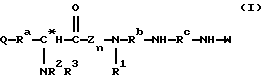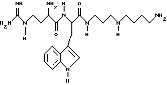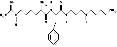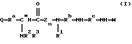 ![]() где Q представляет собой группу положительного заряда, выбранную из ряда амидогрупп или групп с формулой XYN-, где Х и Y одинаковы или отличаются, и каждый может представлять собой атом водорода, С1-С6-алкил, или простую группу, содержащую гетероатом, или совместно с атомом азота, к которому они присоединены, образуют гетероциклическую группу с азотом; Ra представляет собой прямую или разветвленную цепь алкилена или алкиленовую группу, имеющую от 1 до 6 атомов углерода и каждая из которых может быть выборочно замещена от 1 до 4 алкильными группами с числом углеродных атомов от 1 до 3. Rb и Rc обе представляют собой алкилен или алкиленовую группу, содержащую 3 или 4 атома углерода в прямой цепи, каждая из которых может быть выборочно замещена 1 или 2 двумя алкильными группами, каждая из которых содержит от 1 до 3 атомов углерода, при общем числе атомов углерода в указанных прямых цепях Rb и Rc равным 7; R2 и R3 одинаковы или отличаются друг от друга, и каждая представляет атом водорода или группу с формулой R, RCO-, ROCO- или RNHCO-, где R представляет собой алкильную или арильную группу, указанные группы могут быть выборочно замещены одним или большим числом заместителей , определенных ниже; хиральный атом углерода, обозначенный звездочкой в конфигурации;Z – ароматический остаток аминокислоты; n равно 0 или 1; R1 представляет собой атом водорода или более малую алкильную группу, которая может быть выборочно замещена одним или большим числом заместителей , определенных ниже, иW представляет собой атом водорода или алкильную или арильную группы; а заместители выбираются из атомов галогенов, аминогрупп, алкиламиногрупп, диалкиламиногрупп, цианогрупп, гидроксилов, алкильных групп (за исключением случаев замещения алкила), арильных групп, карбамильных, алкил- и диалкилкарбамильных групп и карбоксильных групп и производных последним эфиров,и фармацевтически приемлемые соли соединения, при том, что длина наиболее длинной цепи соединения подразумевает число атомов, исключая водород от 14 до 25. 2. Соединения по п. 1, соответствующие формуле (Iа) ![]() где Q, Ra, Rb, Rc, R2, R3, Z, n и R1 определены в п. 1. 3. Соединения по п. 1, соответствующие формуле (Ib) ![]() где Х, Y, Z, n и R1 определены выше; х – целое число от 1 до 5; у – 3 или 4; R4, R5, R6 и R7 могут быть одинаковыми или различными, и каждая из которых представляет атом водорода или более легкую алкильную группу; а хиральный атом углерода, обозначенный звездочкой в конфигурации;4. Соединения, согласно любому из предыдущих пунктов, в которых Z представляет ароматический аминокислотный остаток в конфигурации.