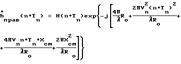 Для элемента разрешения с координатами (Xэp, R0, 0) закон изменения фазы cиагнала в центральном канале![]() В левом и правом каналах, фазовые центры синтезированных апертур которых смещены на один или несколько периодов повторения зондирующих импульсов относительно центрального, закон изменения фазы сигнала от этого элемента разрешения: ![]() ![]() где Хсм=VnТn. В общем случае, это смещение может быть равным Хсм=VnKТn, К=1, 2…. После преобразований получим: ![]() ![]() ![]() На основании того, что опорная функция во всех каналах должна быть настроена на центр кадра, т.е. на точку с координатами (0, R0, 0), можно записать выражения для опорных функций трех каналов: ![]() ![]() ![]() После перемножения сигналов фазовых детекторов на опорные функции сигналы каналов будут равны: ![]() ![]() ![]() Эти сигналы часто называют демодулированными траекторными сигналами из-за того, что в них нет частотной модуляции, как в сигналах с выходов фазовых детекторов. Так как входной сигнал является суперпозицией сигналов от всех элементов разрешения в данной полоске дальности, то и демодулированный сигнал представляет собой сумму сигналов с различной частотой и начальной фазой, соответствующей каждому элементу разрешения. После преобразования этого демодулированного сигнала методом гармонического анализа, каждая его составляющая попадает в соответствующий отсчет БПФ (доплеровский фильтр), после чего появляется возможность компенсации (взаимного уничтожения) сигналов от одинаковых элементов разрешения, если они неподвижны. Так как используется один приемный тракт для трех каналов обработки, то амплитуды сигналов от одних и тех же элементов разрешения будут равны, а для равенства фаз этих сигналов необходимо довернуть по фазе сигналы правого канала на угол ![]() для каждого отсчета БПФ для дальнейшей компенсации сигналов от фона и неподвижных целей. При этом Хэр=m ![]() Х, где m – количество отсчетов БПФ относительно центра кадра, Х – линейное разрешение РСА. Для формирования второго разностного сигнала фазу сигнала центрального канала необходимо также довернуть на фазовый угол, определяемый выражением (1).