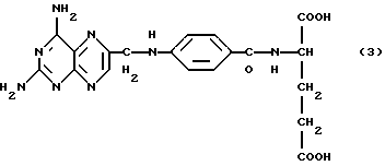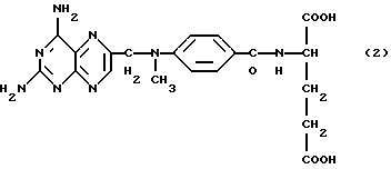 (57) Реферат: Изобретение относится к медицине и касается конъюгата, содержащего D-энантиомер антагониста фолиевой кислоты и носитель, используемого для терапии опухолей. Конъюгат обладает повышенной активностью. 2 с. и 11 з.п.ф-лы, 2 табл. Настоящее изобретение относится к конъюгату, содержащему антагонист фолиевой кислоты и носитель, способу получения такого конъюгата, а также к его применению. Фолиевая кислота является встречающимся в природе соединением, имеющим важное значение для переноса метильных групп в клетках, а тем самым и для роста клеток. Фолиевая кислота имеет следующую структурную формулу: ![]() СН-группа глутаминовой кислоты содержит асимметричный атом. Следовательно, фолиевая кислота существует в двух энатиомерных формах, а именно в виде D- и L-энантиомеров. Однако из этих энантиомерных форм только L-энантиомер находится в клетках, благодаря чему только эта форма фолиевой кислоты, но не D-энантиомер, ответственна за ее действие. Причина этого заключается в том, что фолиевая кислота поглощается клетками через фолатный рецептор, который, однако, поглощает только L-энатиомер фолиевой кислоты, но не поглощает ее D-энантиомер. Антагонистами фолиевой кислоты являются соединения, которые представляют собой производные фолиевой кислоты, но которые противодействуют ей именно в том месте, куда она стремится, т.е. в клетках. Поэтому антагонисты фолиевой кислоты существуют в виде L-энатиомеров, а не в виде D-энатиомеров. Примерами антагонистов фолиевой кислоты являются аминоптерин и аметоптерин, который имеет и другое название – метотрексат. Метотрексат, т. е. L-энантиомер аметоптерина, часто применяется для лечения опухолей и воспалений. При этом, однако, имеют место значительные побочные действия, поскольку метотрексат поглощается также здоровой тканью, для которой он токсичен. Конъюгаты из метотрексата и альбумина, которые более интенсивно поглощаются опухолями, чем здоровой тканью, и тем самым являются менее токсичными, описаны только в DE-A 4122210.5. Тем не менее существует необходимость в разработке средств, которые обладали бы еще меньшими побочными действиями. Исходя из вышеизложенного, в основу настоящего изобретения была положена задача разработать средство для лечения больных тканей, в частности для терапии опухолей, которое обладало бы минимальным побочным действием. Согласно изобретению указанная цель достигается с помощью технических решений, представленных в формуле изобретения. Объектом настоящего изобретения является, следовательно, конъюгат, содержащий D-энантиомер антагониста фолиевой кислоты и носитель. Настоящее изобретение основано на полученных заявителем результатах исследований, которые свидетельствуют о том, что D-энантиомер антагониста фолиевой кислоты в конъюгате, содержащем носитель, предпочтительно поглощается больной тканью, в частности опухолевыми клетками, и в них проявляет свое действие против заболевания. Далее было установлено, что D-энантиомер антагониста фолиевой кислоты как таковой, т.е. существующий не в конъюгате по изобретению, не оказывает побочных действий на здоровую ткань. Понятие “конъюгат” указывает на то, что антагонист фолиевой кислоты и носитель связаны ковалентно, например, через амидные и/или сложноэфирные связи, соответственно через линкер. Понятие “D-энан