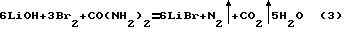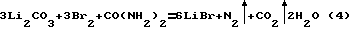Бромсодержащая смесь, образующаяся при отгонке брома воздухом, может содержать примеси хлора (в виде BrCl), от которых смесь очищают, пропуская бромовоздушную смесь через исходный рассол (при высоких содержаниях в нем Вr–) или используя для очистки часть готового концентрированного раствора LiBr. При этом протекает одна из следующих реакций:![]() LiBr+BrCl_ LiBr2+Cl– (2)Очищенная от хлора бромовоздушная смесь улавливается растворами LiOH или пульпой Li2СО3 в присутствии карбамида. Взаимодействие протекает по одной из реакций: ![]() ![]() Степень поглощения брома из бромовоздушной смеси растворами LiOH или пульпой карбоната лития, а также концентрация LiBr зависят от содержания брома в бромовоздушной смеси, поэтому целесообразно использовать смесь брома и конденсата (концентрация брома в бромной воде не превышает 30-35 г/л). Полученный раствор бромида лития с концентрацией 400-500 г/л (плотность 1,2-1,3 г/см3) упаривают до плотности 1,51-1,54 г/см3, если предполагается выпуск товарного LiBr в виде его 55%-ного раствора, или упаривают для получения кристаллической соли до получения пульпы Ж:Т=8:1, затем ее охлаждают кристаллы отделяют на фильтре и сушат при температуре ~100oС. Чем выше содержание LiBr в растворе, тем меньше энергии потребуется на дальнейшее упаривание раствора для кристаллизации из него товарного продукта LiBr 2H2O.