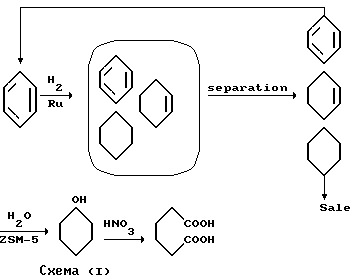 В настоящее время промышленный синтез циклогексена осуществляют путем селективного гидрирования бензола водородом в рамках технологии получения адипиновой кислоты, которую далее используют для синтеза найлона-66 (фирма Asahi Chem. ). Принципиальная схема процесса может быть представлена схемой (I) [G-Belussi, C.Perego, CATTECH, 2000, v. 4, N 1, р. 4]: