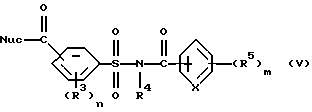 ![]() где Х означает СН или N; R1 означает алкил, алкенил, алкинил, циклоалкил или фенил, причем алкильный и фенильный остатки неэамещены или замещены одним или несколькими остатками из группы, состоящей из галогена и Za-Ra; R2 означает водород, (С1-С6)-алкил, (С2-С6)-алкенил, (C2-C6)-алкинил, или R1 и R2 вместе с соединенным с ними атомом азота образуют 3-8-членный насыщенный цикл; R3 означает галоген, нитро; R4 означает водород, (C1-C4)-алкил; R5 означает галоген, нитро или Zc-Rc; Ra означает (C1-C20)-алкильный остаток; Rc означает (C1-C20)-алкильный остаток; Za означает О; Zc означает простую связь или О; n означает целое число от 0 до 4; m, в случае, если Х означает СН, представляет собой целое число от 0 до 5, и, в случае, если Х означает N, представляет собой целое число от 0 до 4. 2. Амиды ацилсульфамоилбензойной кислоты общей формулы (1) по п.1, где R1 означает (C1-C12)-алкил, (С2-С8)-алкенил, (C2-C8)-алкинил, (С3-С8)-циклоалкил или фенил, причем (C1-C12)-алкильный и фенильный остатки незамещены или замещены одним или несколькими остатками из группы, состоящей из галогена и Za-Ra; R5 означает галоген, нитро или Zc-Rc; Ra означает (C1-C8)-алкильный остаток; Rc означает (C1-С8)-алкильный остаток; Za означает О; Zc означает простую связь или О. 3. Амиды ацилсульфамоилбензойной кислоты общей формулы (I) по п.1 или 2, где R1 означает (C1-C8)-алкил, (С2-С6)-алкенил, (С2-С6)-алкинил, (С3-С6)-циклоалкил или фенил, причем (C1-C6)-алкильный и фенильный остатки незамещены или замещены одним или несколькими остатками из группы, состоящей из галогена и (C1-C8)-алкокси; R5 означает галоген, нитро, (C1-C6)-алкил или (C1-C6)-алкокси. 4. Амиды ацилсульфамоилбензойной кислоты общей формулы (1) по любому из пп. 1-3, где Х означает СН; R1 означает (C1-C6)-алкил, (С2-С6)-алкенил или (С3-С6)-циклоалкил, причем (С1-С6)-алкильный и фенильный остатки незамещены или замещены одним или несколькими остатками из группы, состоящей из галогена и (C1-C8)-алкокси; R2 означает водород, (С1-С6)-алкил; R3 означает галоген; R4 означает водород; R5 означает галоген, нитро, (C1-C4)-алкил или (C1-C4)-алкокси; n означает 0, 1 или 2; m означает 1 или 2. 5. Амиды ацилсульфамоилбензойной кислоты общей формулы (I) по любому из пп. 1-4, где R1 означает (C1-C6)-алкил или (С3-С6)-циклоалкил, причем (C1-C6)-алкильный остаток незамещен или замещен одним или несколькими остатками из группы, состоящей из галогена и (C1-C4)-алкокси. 6. Амиды ацилсульфамоилбензойной кислоты общей формулы (I) по любому из пп. 1-5, где сульфамоильная группа находится в фенильном кольце в положении 4. 7. Амиды ацилсульфамоилбензойной кислоты общей формулы (I) по любому из пп. 1-6, при условии, что R1 не означает фенил, если X означает СН и каждый из R2, R4 и R5 означает водород. 8. Защитные средства для полезных растений, содержащие амид ацилсульфамоилбензойной кислоты по п.7 и обычные для защиты растений вспомогательные средства. 9. Защитные средства для полезных растений, содержащие амид ацилсульфамоилбензойной кислоты по любому из пп.1-6 и один гербицид из группы сульфонилмочевин и имидазолинонов при соотношении гербицида к амиду ацилсульфамоилбензойной кислоты от 2:1 до 1:20. 10. Способ, защиты полезных растений от фитотоксических свойств гербицидов, отличающийся тем, что в культуре полезных растений используют средство по п.8 или 9. 11. Способ получения амидов ацилсульфамоилбензойной кислоты по п.7, отличающийся тем, что а) соединение общей формулы (II) ![]() вводят во взаимодействие с ацилирующим сред