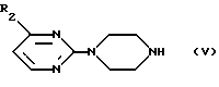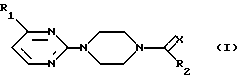 ![]() где Х представляет атом кислорода или серы; R1 представляет С1-С4 алкокси или трифторметильный радикал; R2 представляет С1-С6 алкил; насыщенный С3-С6 циклоалкил; гетероциклоалкил, состоящий из кольца из 3- 6 атомов, гетероатом которого является кислородом, серой или азотом, необязательно N-замещенным С1-С6 алкилом; фенил, необязательно замещенный заместителем, выбранным из фтора, хлора, брома, амино, метила, трифторметила или метокси; гетероарил, состоящий из 5- или 6-членного гетероароматического кольца, гетероатомы которого выбирают из кислорода, серы или азота, необязательно замещенного заместителями, выбранными из хлора, фтора, метила или метокси; или гетероарил, состоящий из конденсированных гетероароматических систем, необязательно замещенных и содержащих 9 атомов, один из которых является гетероатомом, выбранным из серы или азота, причем заместителем является атом хлора; гетероарилалкил, состоящий из С1-С3 алкильной группы и замещенный 5-6-членным гетероароматическим кольцом, возможно замещенным атомом хлора или конденсированной 9-членной гетероароматической системой с 1-2 гетероатомами, выбранными из серы или азота, или его физиологически приемлемые соли. 2. Соединение по п.1, где R1 представляет метокси или этокси. 3. Соединение по п.1, где R2 представляет метил. 4. Соединение по п.1, где R2 представляет циклопропил или циклогексил. 5. Соединение по п.1, где R2 представляет 2-тетрагидрофурил. 6. Соединение по п.1, где R2 представляет 2-фторфенил, 3-фторфенил, 4-фторфенил, 3-хлорфенил, 4-хлорфенил, 2-аминофенил, 2-метилфенил, 2-(трифторметил)фенил, 2-метоксифенил, 3-метоксифенил, 4-метоксифенил. 7. Соединение по п.1, где R2 представляет 2-фурил, 2-тиенил, 3-тиенил, 3-метил-2-тиенил, 3-хлор-2-тиенил, 5-хлор-2-тиенил, 2-пирролил, 2-пиридил, 3-пиридил, 4-пиридил, 3-индолил, 2-бензо[b] тиенил, пиразолил, имидазолил, тиазолил. 8. Соединение по п. 1, где R2 представляет 2-тиенилметил, 2-бензо[b]тиенилметил. 9. Соединение по п.1, выбранное из следующей группы: 2-[4-(2-фурилкарбонил)-1-пиперазинил]-4-метоксипиримидин, хлоргидрат 2-[4-(2-фурилкарбонил)-1-пиперазинил]-4-метоксипиримидина, 4-метокси-2-[4-(2-тиенилкарбонил)-1-пиперазинил]пиримидин, хлоргидрат 4-метокси-2-[4-(2-тиенилкарбонил)-1-пиперазинил] пиримидина, 2-(4-ацетил-1-пиперазинил)-4-метоксипиримидин, 2-{4-[4-(4-хлорпиразолил)бутаноил]-1-пиперазинил}-4-метоксипиримидин, хлоргидрат 2-{4-[4-(4-хлорпиразолил)бутаноил]-1-пиперазинил}-4-метоксипиримидина, 2-(4-бензоил-1-пиперазинил)-4-метоксипиримидин, 2-(4-циклопропилкарбонил-1-пиперазинил)-4-метоксипиримидин, 2-[4-(2-фурилкарбонил)-1-пиперазинил]-4-(трифторметил)пиримидин, 2-[4-(2-тиенилкарбонил)-1-пиперазинил]-4-(трифторметил) пиримидин, 4-метокси-2-[4-(3-тиенилкарбонил)-1-пиперазинил]пиримидин, хлоргидрат 4-метокси-2-[4-(3-тиенилкарбонил)-1-пиперазинил] пиримидина, 2-[4-(3-метил-2-тиенилкарбонил)-1-пиперазинил]-4-метоксипиримидин, хлоргидрат 2-[4-(5-метил-2-тиенилкарбонил)-1-пиперазинил] -4-метоксипиримидина, 4-метокси-2-[4-(3-метокси-2-тиенилкарбонил)-1-пиперазинил] пиримидин, хлоргидрат 4-метокси-2-[4-(3-метокси-2-тиенилкарбонил)-1-пиперазинил] пиримидина, 2-[4-(2-бензо[b]тиенилкарбонил)-1-пиперазинил]-4-метоксипиримидин, хлоргидрат 2-[4-(2-бензо[b] тиенилкарбонил)-1-пиперазинил] 4-метоксипиримидина, 2-[4-(2-индолилкарбонил)-1-пиперазинил]-4-метоксипиримидин, 2-[4-(3-хлор-2-бензо[b]тиенилкарбонил)-1-пиперазинил]-4метоксипиримидин, хлоргидрат 2-[4-(3-хлор-2-бензо[b]тиенилк