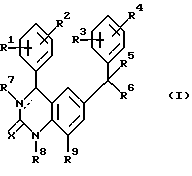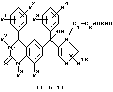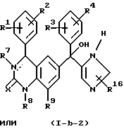 ![]() и их фармацевтически приемлемые кислотно-аддитивные соли и стереохимические изомерные формы, где пунктирная линия является необязательной связью; Х является кислородом; R1 и R2 каждый независимо является водородом или галогеном; R3 и R4 каждый независимо является водородом или галогеном; R5 является водородом, галогеном или радикалом формулы -O-R10 (а-1); -N-R11R12 (а-3), где R10, R11 и R12 являются водородом; R6 является радикалом формулы ![]() ![]() где R16 является водородом или фенилом; R17 является водородом или C1-С6алкилом; R7 является водородом или C1-С6алкилом, при условии, что пунктирная линия не является связью; R8 является водородом, C1-С6алкилом или Het1CH2; R9 является водородом; Het1 является пиридинилом. 2. Соединение по п.1, в котором R1 и R2 каждый независимо выбирают из водорода, галогена; R3 и R4 каждый независимо выбирают из водорода, галогена; R5 является водородом, гидрокси, галогеном или амино; R6 является радикалом формулы (b-1) или (b-2), где R16 является водородом и R17 является С1-С4алкилом; R7 является водородом или С1-С4алкилом, если пунктирная линия не является связью; R является водородом, С1-С4алкилом или Het1СН2; R9 является водородом. 3. Соединение по любому из пп.1-3, в котором Х является кислородом; R1 представляет 3-хлор; R2 является водородом; R3 представляет 4-хлор; R4 является водородом; R5 является водородом; галогеном или амино; R6 является радикалом формулы (b-1) или (b-2), где R16 является водородом и R17 является С1-С2алкилом; R7 является водородом или С1-С2алкилом, если пунктирная линия не является связью; R8 является водородом, C1-С2алкилом или Het1CH2; и R9 является водородом. 4. Соединение по п.1, представляющее собой 6-[амино(4-хлорфенил)(1-метил-1Н-имидазол-5-ил)метил] -4-(3-хлорфенил)-1-метил-2-(1Н)-хиназолинон или 6-[амино(4-хлорфенил)(1-метил-1Н-имидазол-5-ил)метил] -4-(3-хлорфенил)3,4-дигидро-1,3-диметил-2-(1Н)-хиназолинон, его стереоизомерные формы или фармацевтически приемлемые кислотно-аддитивные соли. 5. Фармацевтическая композиция, обладающая ингибирующей фарнезилтрансферазу активностью, включающая фармацевтически приемлемый носитель и в качестве активного ингредиента терапевтически эффективное количество соединения по любому из пп.1-4. 6. Способ получения фармацевтической композиции по п.5, в котором терапевтически активное количество соединения по любому из пп.1-4 тщательно смешивают с фармацевтически приемлемым носителем. 7. Производные хиназолинона общей формулы (XI) ![]() их кислотно-аддитивная соль или стереохимически изомерная форма, где n равно 2 или 3 и R1, R2, R3, R4 и R9 такие, как определены в п.1. 8. Соединение по любому из пп.1-4, обладающее ингибирующей фарнезилтрансферазу активностью. 9. Способ получения производных хиназолинона формулы (I) по п.1, или их фармацевтически приемлемых кислотно-аддитивных солей, или их стереохимических изомерных форм, где пунктирная линия и радикалы X, R1, R2, R3, R4 и R5 имеют значения, определенные в п.1, а R6 является радикалом b-2, определенным в п.1, включающий взаимодействие промежуточного кетона формулы (VI) ![]() с промежуточным соединением формулы ![]() ![]() в присутствии подходящего сильного основания и в присутствии подходящего производного силана, необязательно, с последующим удалением защитной группы PG с получением соединения формулы ![]() ![]() где пунктирная линия и радикалы X, R1, R2, R3, R4, R7, R8, R9 и R16 определены в п.1, с последующим, если необходимо, восстановлением получе