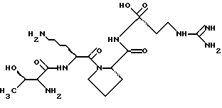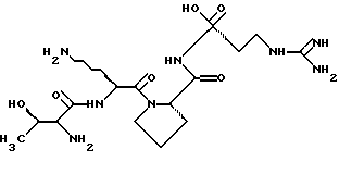 (57) Реферат: Изобретение относится к новому соединению – меченному тритием тафцину и способу определения тафцина в биологических образцах, включающий введение предварительно в образец высокомеченного тритием тафцина, экстракцию, превращение в приготовленном экстракте тафцина и его меченого аналога в их бензоиновые или ортофталевые производные, которые затем анализируют методом ВЭЖХ с флуоресцентным детектором. Предлагаемый тафцин является высокомеченым соединением, а способ позволяет определять микроколичества тафцина. 2 с.п.ф-лы, 2 табл. Изобретение относится к области органической химии и может найти применение в аналитической химии, биоорганической химии, биохимии и прикладной медицине. При изучении физиологически активных соединений необходимы их меченые аналоги. Известен тафцин – тетрапептид Thr-Lys-Pro-Аrg формулы: