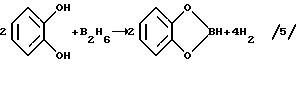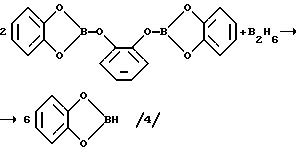 Пример 2. Получение катехолборана осуществляют аналогично примеру 1. Мольное соотношение пирокатехин : диборан составляет 1:0,45. Выдержку реакционной массы проводят при 18-25oС.