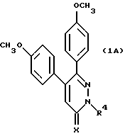 Формула изобретения 1. Производные пиридазина общей формулы I ![]() в которой R1 представляет фенильную или пиридильную группу, которая может быть замещена 1-3 заместителями, выбранными из атомов галогена и низших алкоксигрупп; R2 представляет фенильную группу, которая может быть замещена в 4-м положении низшей алкоксигруппой, низшей алкилтиогруппой, низшей алкилсульфинильной группой или низшей алкилсульфонильной группой и в других положениях 1 или 2 заместителями, выбранными из атомов галогена, низших алкоксильных групп, низших алкилтиогрупп, низших алкилсульфинильных групп и низших алкилсульфонильных групп; R3 представляет атом водорода; низшую алкоксильную группу; галогенированную низшую алкильную группу; низшую циклоалкильную группу; фенильную, пиридильную или фенилоксигруппу, которая может быть замещена 1-3 заместителями, выбранными из атомов галогена, низших алкильных групп, низших алкоксильных групп, карбоксильной группы, низших алкоксикарбонильных групп, нитрогруппы, аминогруппы, низших алкиламиногрупп и низших алкилтиогрупп; незамещенную или замещенную низшей алкильной группой пиперидино, пиперидинильную, пиперазино или морфолиногруппу; незамещенную или замещенную бензильной группой аминокарбонильную группу; низшую алкилкарбонильную группу или незамещенную или замещенную низшей алкильной группой пиперазинокарбонильную группу; А представляет линейную или разветвленную низшую алкиленовую группу, имеющую от 1 до 6 атомов углерода, или линейную или разветвленную низшую алкениленовую группу, имеющую от 1 до б атомов углерода; или А может также означать одинарную связь, когда R3 представляет низшую циклоалкильную группу или галогенированную низшую алкильную группу; Х – атом кислорода или атом серы; при условии, что исключаются следующие комбинации: R1 и R2 представляют 4-метоксифенильную группу, Х представляет атом кислорода, А представляет одинарную связь и R3 представляет атом водорода или 2-хлорэтильную группу, или их соли. 2. Производные пиридазина по п.1, которые являются соединениями, представленными следующей формулой (IA) ![]() где R4 представляет линейную или разветвленную низшую алкильную или низшую алкенильную группу, низшую циклоалкильную группу или низшую циклоалкилметильную группу; Х – атом кислорода или атом серы, или их соли. 3. Производное пиридазина или его соль по п.1, которое представляет собой 5,6-бис(4-метоксифенил)-2-этил-2Н-пиридазин-3-он, 5,6-бис(4-метоксифенил)-2-метил-2Н-пиридазин-3-он, 5,б-бис(4-метоксифенил)-2-изопропил-2Н-пиридазин-3-он, 5,6-бис(4-метоксифенил)-2-изобутил-2Н-пиридазин-3-он, 2-аллил-5,6-бис(4-метоксифенил)-2Н-пиридазин-3-он, 5,6-бис(4-метоксифенил)-2-циклопропил-2Н-пиридазин-3-он, 5,6-бис(4-метоксифенил)-2-циклопропил-метил-2Н-пиридазин-3-он, 5,6-бис(4-метоксифенил)-2-циклопропилметил-2Н-пиридазин-3-тион, 5,6-бис(4-метоксифенил)-2-циклопентил-2Н-пиридазин-3-он, 5,6-бис(4-метоксифенил)-2-циклопентилметил-2Н-пиридазин-3 -он, 5,6- бис(4-метоксифенил)-2-(4-хлорциннамил)-2Н-пиридазин-3-он, 5-(4-хлорфенил)-6-(4-метилтиофенил)-2-бензил-2Н-пиридазин-3-он, 5,6-бис(4-метоксифенил)-2-бензил-2Н-пиридазин-3-тион или 5,6-бис(3-фтор-4-метоксифенил)-2-этил-2Н-пиридазин-3-он, или его соль. 4. Лекарственное средство, которое является ингибитором продуцирования интерлейкина-1- , содержащее в качестве активного ингредиента производное пиридазина или его соль по люб