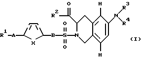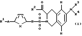 (57) Реферат: Описываются замещенные 6- и 7-аминотетрагидроизохинолинкарбоновые кислоты формулы (1) и/или ее R-изомерная форма, и/или ее физиологически переносимые соли, где R1 фенил, однократно замещенный (С1-С6)-алкил-O-, галогеном; -OR14, где R14 – (С1-С6)-алкил; R2 – НО(Н)N- или R7-O-, где R7 – атом водорода или (С1-С6)-алкил; R3 и R4 – одинаковые или различные и означают атом водорода, R8-(СО)-, где R8 представляет собой R7-О-С(О)-(СН2)n -, n= 0, R7-N(H)-(R9)-C(H)-, где R9 означает характерный радикал протеиногенной 2-аминокислоты аланин, R10-O-C(O)-N(H)-(R9)-C(H)-, где R10 -(С1-С6)-алкил или бензил ; R3 и R4 вместе с атомом N образуют нитрорадикал, А – ковалентная связь, В – (СН2)m, где m=0, х – CH=CH-. Технический результат заключается в том, что соединения являются ингибиторами матрикс металлопротеиназ. 1 з.п.ф-лы, 2 табл.