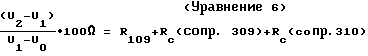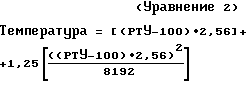 резистором”. 100 омный РТУ измеряется путем сравнения сопротивления РТУ (температурный датчик 109) с 100 омным эталонным сопротивлением (Rref). Когда сопротивление РТУ известно, температура может быть вычислена с использованием характеристического уравнения для конкретного типа РТУ. Производители РТУ дают соответствующее характеристическое уравнение для каждого РТУ. Уравнение 2 есть примерное характеристическое уравнение РТУ. Величина, определенная при решении Уравнения 1, вставляется в уравнение 2, чтобы определить температуру, испытываемую температурным датчиком 109