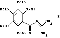 Изобретение относится к бензоилгуанидинам формулы I![]() где обозначают: R(1) – Н, алкил с 1, 2, 3, 4, 5, 6, 7 или 8 С-атомами или Хa-(СН2)b-(СF2)c-СF3, где а, b, с=0, один из двух заместителей R(2) и R(3) означает -O-CO-R(27); R(27) алкил с 1, 2, 3, 4, 5, 6, 7 или 8 С-атомами, и соответственно другой из заместителей R(2) или R(3) определен как R(1); R(4) означает водород, алкокси с 1, 2, 3 или 4 С-атомами, F, Cl, Вr, I; R(5) означает водород, а также к их фармацевтически переносимым солям. Предпочтительны ортозамещенные бензоилгуанидины формулы I, где обозначают: R(1) – Н, алкил с 1, 2, 3, 4, 5, 6, 7 или 8 С-атомами или Хa-(СF2)c-СF3, где а, с=0, один из двух заместителей R(2) и R(3) означает -O-CO-R(27); R(27) алкил с 1, 2, 3 или 4 С-атомами, и соответственно другой из заместителей R(2) или R(3) определен как R(1); R(4) означает водород, алкокси с 1 или 2 С-атомами, F, Cl и R(5) означает водород, а также их фармацевтически переносимые соли. Особенно предпочтительными являются соединения формулы I, где обозначают: R(1) – Н, алкил с 1, 2, 3 или 4 С-атомами или Хa-СF3, где а=0, один из двух заместителей R(2) и R(3) означает -O-CO-R(27); R(27) алкил с 1, 2, 3 или 4 С-атомами, и соответственно другой из заместителей R(2) или R(3) определен как R(1); R(4) означает метокси, F, Cl и R(5) означает водород, а также их фармацевтически переносимые соли. Особенно предпочтительны ортозамещенные бензоилгуанидины формулы I, где обозначают: R(1) – Н, алкил с 1, 2, 3 или 4 С-атомами или СF3, один из двух заместителей R(2) и R(3) означает -O-СО-СН3; и соответственно другой из заместителей R(2) или R(3) определен как R(1); R(4) означает метокси, F, Cl; R(5) означает водород, а также их фармацевтически переносимые соли. Указанные алкильные остатки могут иметь прямую или разветвленную цепь. Соединения формулы I согласно изобретению могут быть получены способом, заключающимся в том, что соединение формулы II ![]() где R(1)-R(5) имеют указанные выше значения, и L обозначает легко нуклеофильно замещаемую удаляемую группу, подвергают взаимодействию с гуанидином. Активированные производные кислоты формулы II, где L обозначает алкокси-, предпочтительно метоксигруппу, феноксигруппу, фенилтио-, метилтио-, 2-пиридилтиогруппу, азотистый гетероцикл, предпочтительно 1-имидазолил, предпочтительно получают известным способом из хлорангидридов карбоновой кислоты (формула II, L-Cl), которые, в свою очередь, можно получать также известным способом из соответствующих карбоновых кислот (формула II, L=ОН), например с хлористым тионилом. Наряду с хлорангидридами карбоновой кислоты формулы II (L=Cl) можно получать также другие активированные производные кислоты формулы II известным способом прямо из лежащих в основе производных бензойной кислоты (формула II, L= ОН), как сложный метиловый эфир формулы II с L=ОСН3 обработкой газообразной НСl в метаноле, имидазолиды формулы II обработкой карбонилдиимидазолом [L= 1-имидазолил, Staab, Angew. Chem. английское издание 1, 351-367 (1962)], смешанные ангидриды II с Cl-COOC2H5 или хлористым тозилом в присутствии триэтиламина в инертном растворителе, как и активирования бензойных кислот с дициклогексилкарбодиимидом (ДCС) или с O-[(циано(этоксикарбонил)метилен)амино] -1,1,3,3-тетраметилурон-тетрафторборатом (“TOTU”) (Proceedings of the 21 European Peptide Symposium, Peptides 1990, Editors E.Giralt and D. Andreu, Escom, Leiden, 1991). Ряд подходящих методов для получения активированных производных карбоновой кислоты формулы II указаны в литературном источнике в J. March, Advanced Organic Chemistry, издание 3 (John Wiley & Sons, 1985), стр.350. Взаимо