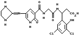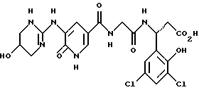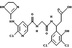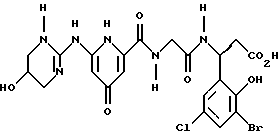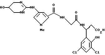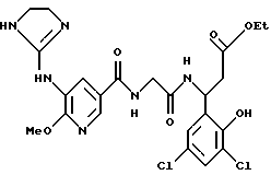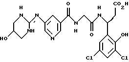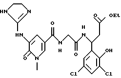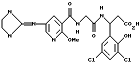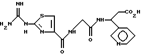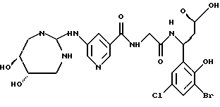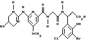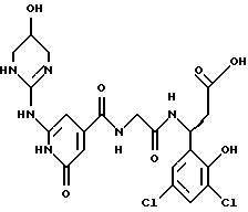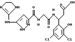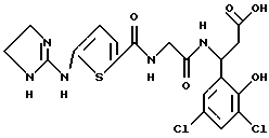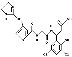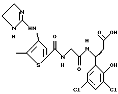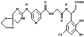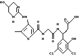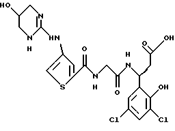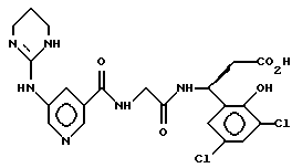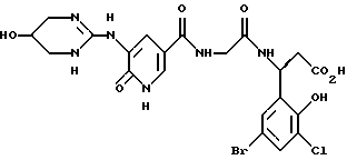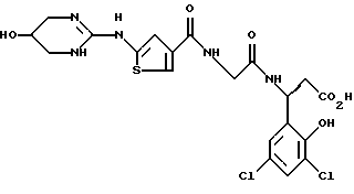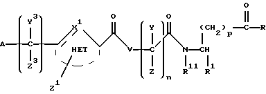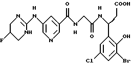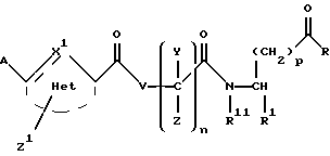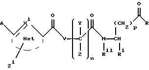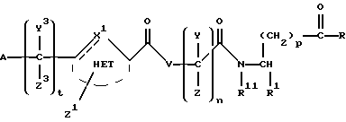 (57) Реферат: Изобретение относится к группе новых соединений – гетероциклических производных глицил-бета-аланина общей формулы I ![]() или фармацевтически приемлемая соль этого соединения, где ![]() является 5-8-членным моноциклическим гетероциклическим, необязательно ненасыщенным кольцом, содержащим от 1 до 4 гетероатомов, выбранных из группы, включающей N и S, причем 1 выбран из группы, включающей СН, СН2, N, NH, О и S, при условии, что ![]() не является пирролидинилом, когда V обозначает NH; А представляет собой группу формулы ![]() где Y1 выбран из группы, включающей N-R2, причем R2 означает водород; R2 означает водород, R7, когда не вместе с R2, и R8 означают водород, алкил, замещенный алкокси группой, или R2 вместе с R7 образуют 4-12-членный, содержащий 2 атома азота гетероцикл, необязательно замещенный одним или несколькими заместителями, выбранными из группы, включающей гидрокси, С1-С10алкил, галоид, спиродиоксалан; А обозначает группу ![]() где R2 вместе с R7 образуют 5-8-членный, содержащий два атома азота гетероцикл, R5 означает водород, R8 означает алкил, необязательно замещенный акоксигруппой; или A обозначает группу ![]() где R2 вместе с R7 образуют 5-8-членный, содержащий 2 атома азота гетероцикл, необязательно замещенный гидроксигруппой; R8 – алкил, замещенный алкоксигруппой; V означает -N-(R6)-; R6 – водород; Y и Z означают водород, t = 0, n и р = 1, 2; R означает Х-R3, где Х -О-; R3 – водород, алкил; R1 выбран из группы, включающей арил, алкил, необязательно замещенный однократно или многократно галоидом, алкилом, ОН; моноциклический гетероцикл; галоидалкил; R11 означает водород, или фармацевтически приемлемая соль этого соединения; фармацевтической композиции, обладающей свойствами антагониста V 3-интегрина, а также к способу лечения заболеваний, опосредованных V 3-интегрином у млекопитающих. 3 с. и 19 з.п. ф-лы, 1 табл.