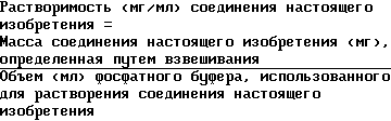 (2) Ингибирование нейротоксичности, индуцируемой каиновой кислотой:Нейротоксичность выражали в виде активности лактатдегидрогеназы, высвобождаемой в культуральную среду вследствие гибели клеток. В качестве контроля использовали нейроны, обработанные в течение 24 часов бессывороточной средой, содержащей 30 мкМ каиновой кислоты. Нейроны подвергали воздействию каждого из испытуемых соединений вместе с 300 мкМ каиновой кислотой в течение 24 часов, после чего оценивали ингибирующее действие каждого из соединений, направленное предотвращение гибели нейронов, вызываемой каиновой кислотой. В результате этих испытаний было установлено, например, что IC50 для соединения Примера 1 составляет 0,8 мкМ; IC50 для соединения Примера 9 составляет 0,96 мкМ; а IC50 для соединения Примера 19 составляет 0,48 мкМ, что свидетельствует о том, что эти соединения обладают сильным ингибирующим действием. (3) Измерение ингибирующего действия, направленного на подавление рефлекторных слуховых эпилептических припадков у мышей DBA/2: Десять 21-28-дневных машей-самцов подвергали слуховой стимуляции звуком в 12 кГц и 120 дБ в звуковой испытательной камере в течение 1 минуты или до тех пор, пока у мышей не возникнет тонической эпилептический припадок. Испытуемое соединение суспендировали в 0,5%-ном растворе метилцеллюлозы или растворяли в физиологическим растворе, и полученную суспензию или раствор вводили мышам внутрибрюшинно за 15 минут до начала стимуляции звуком. Эффективность лекарственного средства оценивали при появлении и в отсутствие припадков, и определяли минимальную эффективную дозу (MED). Результаты этих оценок показали, что соединение Примера 1, соединение Примера 9 и соединение Примера 19 подавляли слуховой эпилептический припадок у мышей при концентрациях 3 мг/кг, 10 мг/кг и 1 мг/кг, соответственно. (4) Измерение растворимости: Получение буфера: К 0,1 М водному раствору первичного кислого фосфата калия добавляли 0,1 М водный раствор первичного кислого фосфата натрия; при этом получали буферы, которые имели рН 5, 6, 7 и 8, соответственно. Измерение растворимости: Примерно 5-миллиграммовые порции соединения настоящего изобретения точно взвешивали в четырех стеклянных лабораторных пробирках и добавляли 0,1 мл фосфатных буферов, имеющих pH 5, 6, 7 и 8, соответственно, после чего пробирки интенсивно встряхивали. Растворимость определяли как величину, полученную из нижеследующего уравнения: ![]() Результаты этих измерений представлены в Таблице 1. Соединение Примера 9 имело растворимость 4100 мкг/мл при pH 6. Таким образом, соединение настоящего изобретения имеет высокую растворимость даже при нейтральных или близких к нейтральным значениях pH. В соответствии с этим, соединение настоящего изобретения может быть с успехом включено в качестве активного ингредиента в препараты для перрорального введения, такие как таблетки и капсулы, или в препараты для парентерального введения, например для инъекций. Кроме того, соединение настоящего изобретения обладает высокой, а поэтому прекрасной растворимостью в крови даже при клиническом введении, и не подвергается легкому осаждению в органах, что придает этому соединению особую ценность. Таблицу 1 см. в конце текста. Фармацевтический препарат, содержащий одно или несколько соединений настоящего изобретения или его соли в качестве эффек