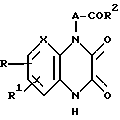(57) Реферат: Описываются новые производные 1,2,3-тетрагидрохиноксалиндиона формулы I, где значения А, R, R1, R2, Х указаны в п.1 формулы, которые обладают антагонистическим действием по отношению к глутаматному рецептору, высокой степенью сродства к AMPA-рецепторам, не являющимся NMDA-рецепторами, сильным ингибирующим действием, направленным против нейротоксичности, вызываемой каиновой кислотой, ингибирующим аудиогенный приступ действием, и высокой степенью растворимости. Описывается также фармацевтическая композиция на основе соединений формулы I. 2 с. и 6 з.п. ф-лы, 7 табл.