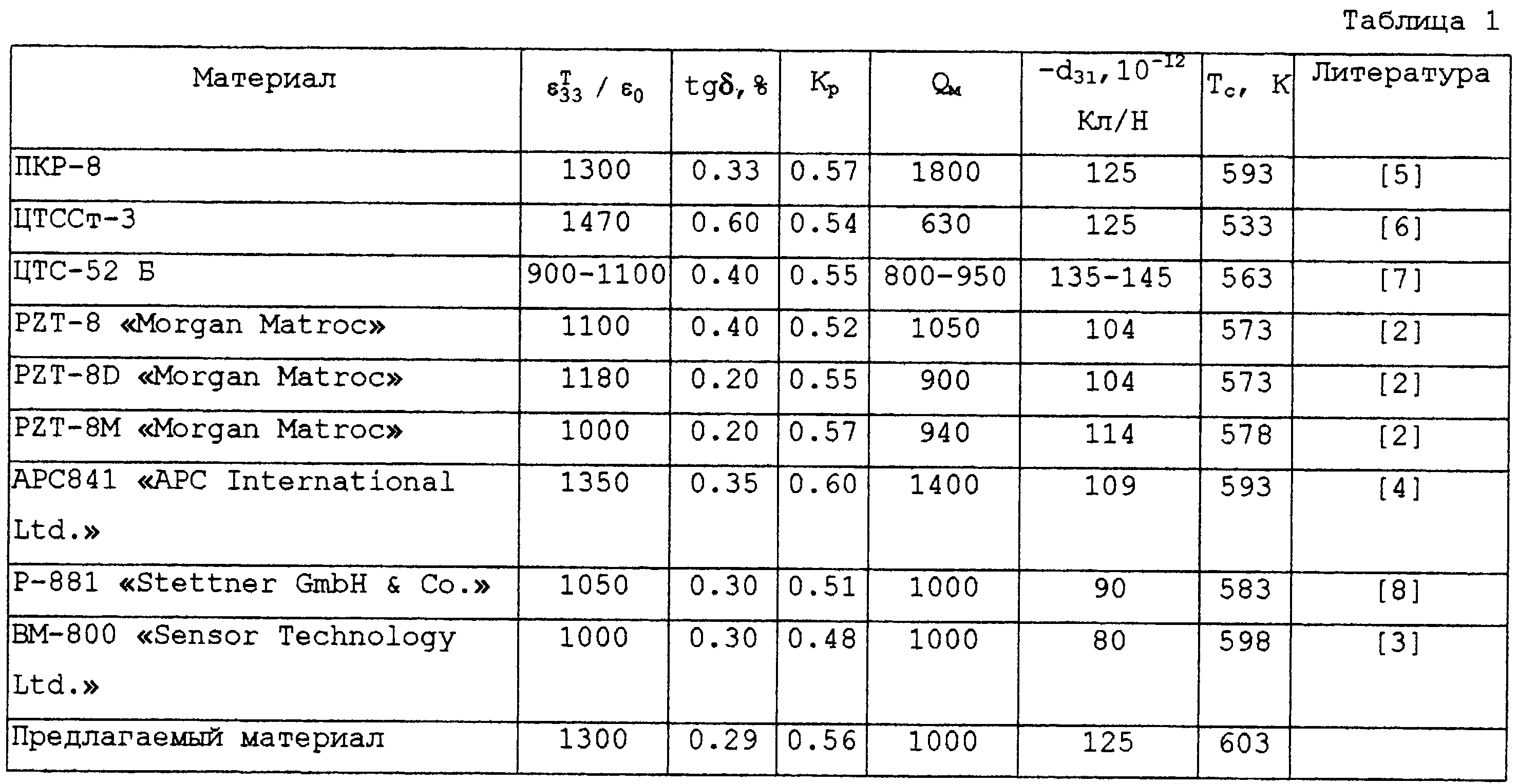 m~1000, тангенс угла диэлектрических потерь tg в интервале 0,30-0,40, величину коэффициента электромеханической связи Кр от 0,48 до 0,60 и величину диэлектрической проницаемости Т33 / 0 в интервале 1000-1300.