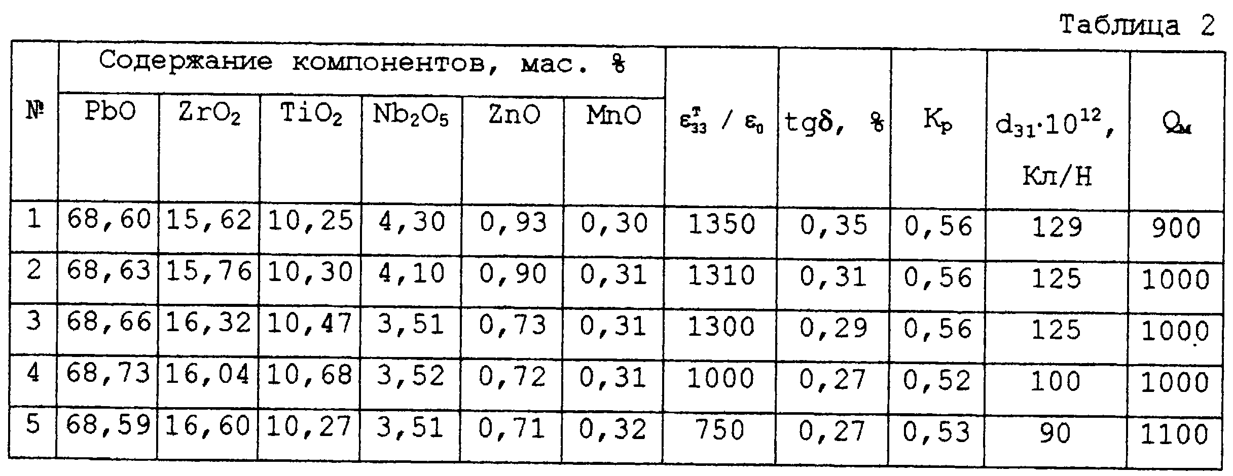 В табл. 2 приведены основные электрофизические характеристики предлагаемого материала в зависимости от состава. Полученные экспериментальные данные свидетельствуют о том, что предлагаемый пьезокерамический материал обладает оптимальными, с точки зрения решаемой технической задачи, характеристиками в интервале величин компонентов, указанных в формуле изобретения.