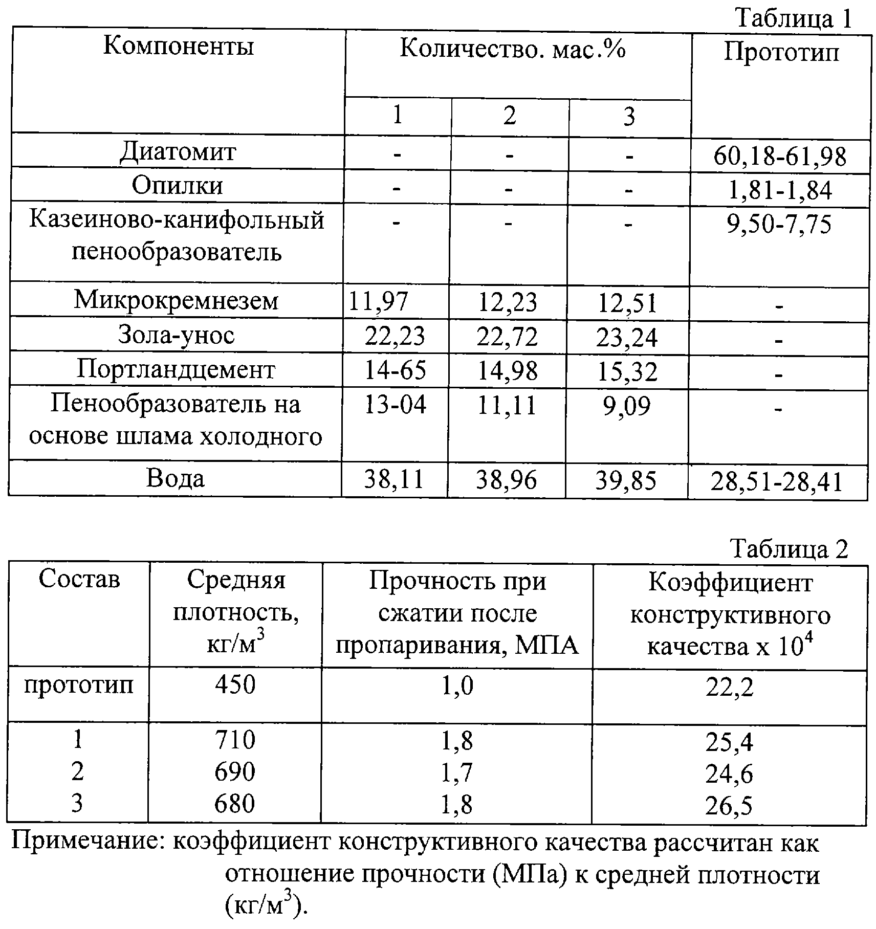 (57) Реферат: Изобретение относится к составам для приготовления неавтоклавных ячеистых бетонов, используемых для изготовления строительных конструкций. Технический результат: повышение прочности и коэффициента конструктивного качества при удовлетворительных показателях прочности, снижение себестоимости материала, расширение сырьевой базы. Сырьевая смесь для приготовления керамических теплоизоляционных материалов включает кремнеземистый компонент, добавки, пенообразователь и воду, причем в качестве кремнеземистого компонента содержится микрокремнезем с удельной поверхностью более 25 тыс.см2/г и содержанием аморфного SiO2 90…95%, в качестве добавок – зола-унос и портландцемент, в качестве пенообразователя – лигнин талловый омыленный стабилизированный клеем костным или мездровым при следующем соотношении компонентов, мас.%: микрокремнезем 11,97-12,51; зола-унос 22,23-23,24; портландцемент 14,65-15,32; пенообразователь 9,09-13,04; вода 38,11-39,85. 2 табл. Изобретение относится к составам для приготовления неавтоклавных ячеистых бетонов, используемых для изготовления строительных конструкций. Наиболее близким аналогом является сырьевая смесь, включающая в мас.%: диатомит 60.18-61.98, опилки 1.81-1.84, казеино-конифольный пенообразователь 9.50-7.75, вода 28.51-28.41 [1]. Недостатком указанной смеси является необходимость высококачественного сырья и относительно низкая прочность материала. Технический результат – повышение прочности и коэффициента конструктивного качества при удовлетворительных показателях прочности, снижение себестоимости материала, расширение сырьевой базы. Технический результат достигается тем, что в качестве сырьевых компонентов используется микрокремнезем, зола-унос, цемент, пенообразователь и вода при следующем соотношении компонентов, мас.%: Мнкрокремнезем 11,97-12,51 Зола-унос 21,23-23,24 Портландцемент 14,65-15,32 Пенообразователь 9,09-13,04 Вода 38,11-39,85 Пенообразователь готовят отдельно в соответствии с патентом РФ № 20086519, МКИ С 04 В 28/02, 1997 г. путем смешивания предварительно замоченного животного клея с ангинном талловым омыленным и последующего растворения пастообразного пенообразователя в воде при температуре 40-50°С при следующем соотношении компонентов (в мас.%): Талловый лигнин омыленный 5-15 Клей костный или мездровый 2,5-7,5 Вода Остальное Золы-унос от сжигания бурых углей Канско-Ачинского бассейна (Ирша-бородинское, Назаровсое, Березовское месторождения) являются высококальциевыми и содержат, в мас.%: SiO2 – 21…55; Al2O3 – 4…11; Fe2O3 – 6…16; CaO – 20…46; MgO – 3…6; К2O – 0,2…1,5; Na2O – 0,2…0,6; SO3 – 0,9…9; CaOсв – 3…13; горючих примесей – не более 2…2,5. Микрокремнезем производства кристаллического кремния является дисперсным отходом, характеризующимся малым размером частиц (0,1…3 мк) и, как следствие, высокой удельной поверхностью (более 25 тыс.см2/г). Микрокремнезем осаждается в электрофильтрах системы газоочистки плавильных печей производства кристаллического кремния. Химический состав микрокремнезема (в мас.%): SiO2 90…95, Al2O3 до 0,8, Fe2O3 до 0,8, СаО до 1,6, MgО до 1,2, SiC до 5, Собщ до 9, К+ до 0,25, Na+ до 0,06, п.п.п. до 20. Портландцемент М400 производства Ачинского цементного завода. Талловый лигнин образуется при извлечении таллового масла из сульфатного мыла при действии серной кислоты и представляет собой устойчивую дисперсную систему из сульфатного лигнина, таллового масла, воды н неор