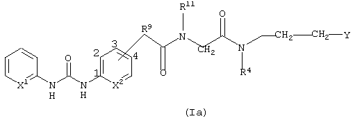 X1 и Х2 каждый независимо представляет CR2 (где каждая группа R2 является такой, как определено в одном из пп.1, 3, 4, 5 или 6) и -R9-CON(R11)-CH2-CON(R4)-CH2-CH2-Y присоединяется к кольцу в 3- или 4-м положении,