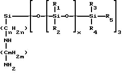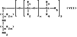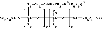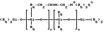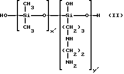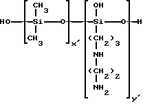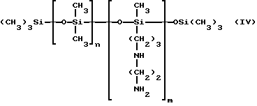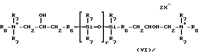 Согласно изобретению, аминированным силиконом называют любой силикон, содержащий, по крайней мере, одну первичную, вторичную, третичную аминогруппу или четвертичную аммониевую группу. Так, можно назвать следующие аминированные силиконы:(а) полисилоксаны, называемые, согласно словарю Ассоциации по парфюмерно-косметическим товарам и душистым веществам, “амодиметиконы” и отвечающие формуле (II): ![]() в которой x’ и у’ означают целые числа, зависящие от молекулярной массы, обычно такие, что вышеуказанная средневесовая молекулярная масса составляет примерно от 5000 до 500000; (б) аминированные силиконы, отвечающие формуле (III): R’aG3-a-Si(OSiG2)n– (OSiGbR’2-b)m-O-SiG3-a-R’a (III) в которой G означает атом водорода или фенил, гидроксил или алкил с 1-8 атомами углерода, например, метил; a означает число 0 или целое число от 1 до 3, в особенности 0; b означает нуль или 1, и в особенности 1; m и n означают такие числа, чтобы сумма (n + m) могла изменяться особенно от 1 до 2000, и в особенности от 50 до 150, причем n может означать число от 0 до 1999, и особенно от 49 до 149, а m может означать число от 1 до 2000, и особенно от 1 до 10; R’ означает одновалентный радикал формулы -CqH2qL, в котором q означает число от 2 до 8 и L означает кватернизованную или некватернизованную аминогруппу, выбираемую среди следующих групп: -NR”-CH2-CH2-N'(R”)2; -N(R”)2; -N+(R”)3A–; -NH+(R”)2A–; -NH2+(R”)A–; -N(R”)-CH2-CH2-N+R”H2A–; в которых R” может означать водород, фенил, бензил или одновалентный насыщенный углеводородный радикал, например, алкильный радикал с 1-20 атомами углерода, и A– означает галоген-анион, такой как, например, фтор-, хлор-, бром- или иод-анион. Соответствующим этому определению продуктом является силикон, называемый “триметилсилиламодиметикон”, отвечающий формуле (IV): ![]() в которой n и m имеют вышеуказанные значения (см. формулу (III)). Такие полимеры описываются, например, в заявке на европейский патент 95238; (в) аминированные силиконы, отвечающие формуле (V): ![]() в которой R5 означает одновалентный углеводородный радикал с 1-18 атомами углерода и, в особенности, алкильный радикал с 1-18 атомами углерода или алкенильный радикал с 2-18 атомами углерода, например, метил; R6 означает двухвалентный углеводородный радикал, особенно алкиленовый радикал с 1-18 атомами углерода, или двухвалентный алкиленокси-радикал с 1-18 атомами углерода, например, с 1-8 атомами углерода, связанный с кремнием связью SiC; Q– означает анион, такой как галотен-анион, особенно хлор-анион, или анион соли органической кислоты (ацетат…); r означает среднестатистическую величину от 2 до 20, в особенности от 2 до 8; s означает среднестатистическую величину от 20 до 200 и в особенности от 20 до 50. Такие аминированные силиконы более предпочтительно описываются в патенте США 4185087. Входящим в этот класс силиконом является силикон, выпускаемый в продажу фирмой Юньон Карбид под названием “Ucar Silicone ALE 56”; (г) силиконы с четвертичными аммониевыми группами формулы (VI): ![]() в которой R7, одинаковые или разные, означают одновалентный углеводородный радикал с 1-18 атомами углерода и в особенности алкильный радикал с 1-18 атомами углерода, алкенильный радикал с 2-18 атомами углерода или цикл, включающий 5 или 6 атомов углерода, например, метил; R6 означает двухвалентный углеводородный радикал, особенно алкиленовый радикал с 1-18 атомами углерода, или двухвалентный алкиленокси-радикал с 1-18 атомами углерода, наприм