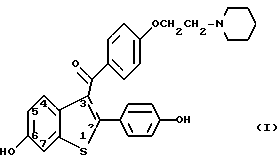 Пример 26-Гидрокси-2-(4-гидроксифенил)-3[4-(2- пиперидиноэтоксибензоил] бензо[b] тиофен Порцию в 3,6 г 6- метансульфонилокси-2-(4-метансульфонилоксифенил)-3-[4-(2-пиперидиноэтокси) бензоил] бензо[b]тиофена растворяют в 100 мл тетрагидрофурана и 40 мл метанола и добавляют 10 мл 5н гидроксида натрия. Полученную смесь перемешивают в течение 16 часов при комнатной температуре, а затем обрабатывают по способу примера 1 до получения 3,5 г твердого желтого продукта. Этот продукт очищают на хроматографической колонке с силикагелем, элюируя (с градиентом) растворителем от 5% метанола в хлороформе до 30% метанола в хлороформе. Фракции, содержащие продукт, выпаривают до получения 1,85 г маслянистого продукта, который перекристаллизовывают из ацетона и получают 1,25 г очищенного продукта. Т.пл. 141-144oC. Пример 3 Гидрохлорид 6-гидрокси-2- (4-гидроксифенил) -3[4- (2- пиперидиноэтокси) бензоил] бензо[b]тиофена В атмосфере азота смесь 3 г гидрохлорида 4-(2-пиперидиноэтокси) бензойной кислоты, 2 капель диметилформамида, 2,5 мл тионилхлорида и 40 мл хлорбензола нагревают при 70-75oC в течение около одного часа. Затем отгоняют избыток тионилхлорида и 15-20 мл растворителя. Оставшуюся суспензию охлаждают до комнатной температуры, и к этому добавляют 100 мл дихлорметана, 2,7 г 6-метокси-2-(4-метоксифенил) бензо[b]тиофена и 10 г алюминийхлорида. Полученный раствор перемешивают около одного часа, добавляют 7,5 мл этантиола, и полученную смесь перемешивают в течение 45 мин или более. Затем добавляют 40 мл тетрагидрофурана, затем 15 мл 20%- ной соляной кислоты с экзотермом до рефлюкса. Добавляют 50 мл воды и 25 мл насыщенного водного натрийхлорида. Полученную смесь перемешивают и оставляют охлаждаться до комнатной температуры. Осадок собирают фильтрованием и промывают последовательно 30 мл воды, 40 мл 25%-ного водного тетрагидрофурана и 35 мл воды. Затем твердую часть сушат при 40oC в вакууме до получения 5,05 г продукта, который идентифицируют по данным ЯМР: : 1,7 (6H, м, N(CH2 2,6-3,1 (2H, м, NCH2); 3,5-4,1 (4H, м, NCH2); 4,4 (2H, м, OCH2); 6,6-7,4 (9H, м, ароматика); 7,7 (2H, д, ароматика орто до СО); 9,8 (2H, м, ОН).
