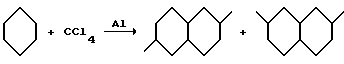 Пример. В стеклянный реактор объемом 50 мл, в атмосфере аргона помещается 0,348 г (13 ммоль) алюминия и несколько кристаллов йода, нагревают на спиртовке до полной возгонки йода. Реактор помещают на магнитную мешалку, и добавляют 7 мл (65 ммоль) циклогексана, 2 мл (19 ммоль) ССl4. Перемешивание реакционной смеси продолжают при комнатной температуре 2 часа. Реакция сопровождается выделением НСl. По окончании реакции образуется два слоя: прозрачный верхний слой и темно-коричневый вязкий, содержащий остатки хлорида алюминия, нижний слой. Верхний слой отбирают, пропускают через Аl2О3. Анализ методом ГЖХ получившейся бесцветной прозрачной жидкости показал содержание диметилдекалинов – 39% в расчете на исходный циклогексан в том числе: 45% изомера I, 41% изомера II, по 2-3% 4 неидентифицированных изомеров диметилдекалина с М+= 166 и 5 изомеров с М+=166 по 0,2-0,3% и не прореагировавшего циклогексана 19,6%.
