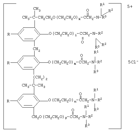 2. Способ получения пента{[поли(этиленокси)карбонилметил]аммониевых}производных трехъядерных трифенолов формулы, указанной в п.1, заключающийся во взаимодействии монохлоруксусной кислоты с оксиэтилированным продуктом конденсации алкилфенолов с 4,4-диметил-диоксаном-1,3 общей формулы