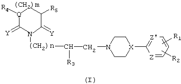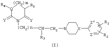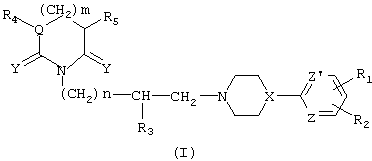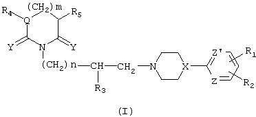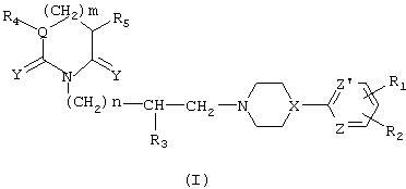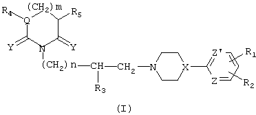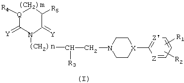 (57) Реферат: Изобретение относится к новым арилпиперазиновым производным общей формулы I ![]() и их фармацевтически приемлемым солям, сложным эфирам, где Y представляет О; Q представляет СН; X, Z и Z’ каждый независимо представляют СН или N; m=0-1; n=0-4; R1 и R2 независимо выбирают из Н, F, Cl, Br, OCH3, OC2H5, OCH2CF3, СН3, С2Н5, СF3, изопропилокси; R3 представляет Н; R4 и R5 представляют Н или фенил, за исключением того, что R1 представляет Н, R2 представляет Н, Cl или CF3, R3, R4 и R5=Н, Y=0, и Q=CH, если m=0 и n=1; и также за исключением того, что R1 представляет Н, R2 представляет OCH3, R3, R4 и R5=H, Y=0, Q=CH, если m=0 и n=2. Изобретение также относится к способам получения этих соединений, фармацевтической композиции на их основе, обладающей уроселективной антогонистической активностью в отношении к 1-адренорецепторам, и способам лечения доброкачественной гипертрофии предстательной железы, сосудистых заболеваний, застойной сердечной недостаточности и гипертензии. Технический результат – получение новых соединений, обладающих ценными фармацевтическими свойствами. 8 с. и 14 з.п. ф-лы, 6 табл.