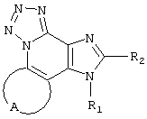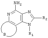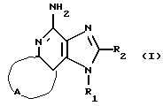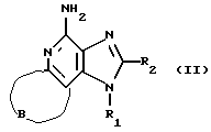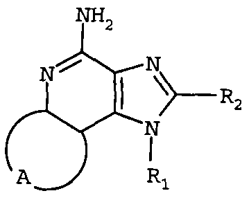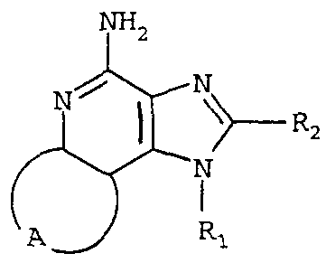 (57) Реферат: Изобретение относится к новым имидазонафтиридинам формул (I) и (II), в которых А представляет собой =N-CR=CR-CR=, =CR-N=CR-CR=, =CR-CR=N=CR или = CR-CR= CR-N= ; B представляет собой -NR-C(R)2-C(R)2-С(R)2, C(R)2-NR-C(R)2-C(R)2, -C(R)2-C(R)2-NR-C(R)2 или C(R)2-C(R)2-C(R)2-NR, где R – водород, R1 – водород, незамещенный или замещенный С1-20-алкил, С1-20-алкилен-NR3-Q-X-R4, где Q – представляет -СО или -SO2-, Х – простая связь, -О- или -NR3 и R4 – арил, гетероарил, гетероциклил или С1-20-алкил или С2-20-алкенил. Другие значения радикалов представлены в формуле изобретения. Соединения формул (I) и (II) стимулируют биосинтез цитокинов, таких как интерферон и фактор некроза опухоли, и могут быть использованы в медицине. Изобретение также относится к фармацевтическим композициям и промежуточным соединениям. 10 с. 10 з.п. ф-лы, 5 табл. ![]()