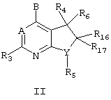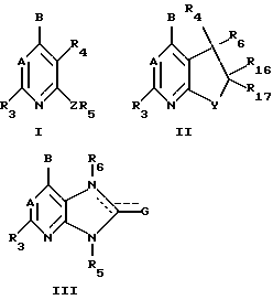 (57) Реферат: Изобретение относится к новым соединениям общих формул I, II, III ![]() или их фармацевтически приемлемым солям, в которых пунктирными линиями обозначены необязательные двойные связи; A – -CR7 или N; В – -NR1R2, -CR1R2R11, -C(= CR2R12)R1, -NHCHR1R2, -ОСHR1R2, -SCHR1R2, -CHR2OR12, -CHR2SR12, -C(S)R2 или -C(O)R2, N-этил-2,2,2-трифторацетамид; G – кислород, сера, NH, NH3, водород, метокси, этокси, трифторметокси, метил, этил, тиометокси, NH2, NHCH3, N(СН3)2 или трифторметил; Y-N; Z – NH, О, S, -N(C1-C2 алкил) или -C(R13R14), где R13 и R14 независимо друг от друга представляют собой водород, трифторметил или метил, либо один из элементов R13 и R14 является цианогруппой, а другой – водородом или метилом; R1 – C1-С6 алкил, который может быть необязательно замещен одним или двумя заместителями R8, независимо друг от друга выбираемыми из группы, включающей гидрокси, фтор, хлор, бром, йод, CF3, C1-C4 алкокси, -O-CO-(C1-C4 алкил), где (C1-C4) алкильные части вышеуказанных групп R1 могут необязательно иметь одну углерод-углеродную двойную или тройную связь; R2 – C1-C12 алкил, арил или -(C1-C4 алкилен)арил, где арилом является фенил, нафтил; R3 – метил, этил, фтор, хлор, бром, йод, циано, метокси, OCF3, метилтио, метилсульфонил, СН2ОН или CH2OCH3; R4 – водород, C1-C4 алкил, фтор, хлор, бром, йод, С1-С4 алкокси, трифторметокси, -СН2OCH3, -СН2OCH2СН3, -СН2СН2OCH3, -CF3, амино, нитро, -NH(C1-C4 алкил), -N(СН3)2, -NHCOCH3, -NHCONHCH3, гидрокси, -CO(C1-С4 алкил), -СНО, СООН, циано или -COO(C1-C4 алкил), где C1-C4 алкил может быть замещен одним заместителем, выбираемым из группы, включающей гидрокси, амино, -NHCOCH3, -NH(C1-C2 алкил), -N(C1-C2 алкил)2, фтор, хлор, циано, нитро; R5 – фенил, нафтил, пиридил, пиримидил, где каждая из вышеуказанных групп R5 замещена одним-тремя заместителями, которые независимо друг от друга выбирают из фтора, хлора, C1-С6 алкила или C1-С6 алкоксила, или одним заместителем, выбираемым из группы, включающей гидрокси, йод, бром, формил, циано, нитро, трифторметил, амино, -(C1-С6 алкил)O(С1-С6) алкил, и где C1-C4 алкильная и C1-C4 алкильная части вышеуказанных групп R5 могут быть необязательно замещены одной гидроксигруппой; R6 – водород или C1-С6 алкил; R7 – водород, метил; R11 – водород, гидрокси, фтор или метокси; R12 – водород или C1-C4 алкил и R16 и R17 независимо друг от друга представляют собой водород, гидрокси, метил, этил, метокси или этокси, за исключением того, что оба элемента R16 и R17 не могут одновременно быть метокси или этокси; либо R16 и R17 вместе образуют оксо (=O) группу; при условии, что если G является атомом кислорода, серы, NH или NCH3, то он присоединяется двойной связью к пятичленному кольцу формулы III, и далее при условии, что R6 отсутствует, если атом азота, с которым он связан, присоединяется двойной связью к смежному атому углерода в кольце. Соединения являются антагонистами кортикотропин-рилизинг фактора, что позволяет использовать их в фармацевтической композиции. Описаны способы получения этих соединений. 9 с. и 17 з.п.ф-лы. Текст описания в факсимильном виде (см. графическую часть)а Формула изобретения 1. Соединения I, II или III