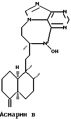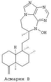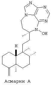 (с=0,5, СНСl3), IR 3400, 2928, 1600, 1553, 1451, 1400, 1388, 900 см-1, структура Асмарина была подтверждена путем рентгеноструктурного анализа. С тем же раствором был также выделен Асмарин В, (120 мг) в виде маслянистой жидкости, m/z+= 423 (С25Н37N5O), (100%) 188 (C8H6N5O+), [