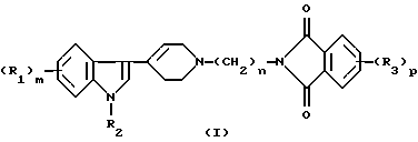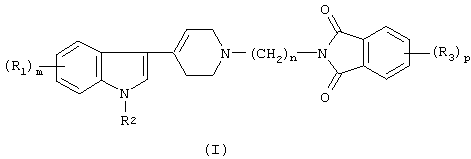 (57) Реферат: Изобретение относится к соединениям формулы (I) ![]() где R1 представляет собой водород, галоген, CF3, алкил(1-3С) или CN; m равно 0, 1 или 2; R2 представляет собой водород или алкил (1-3С); n равно 3, 4, 5 или 6; R3 представляет собой водород, галоген или алкил(1-4С); р равно 0, 1 или 2, или его фармакологически приемлемым кислотно-аддитивным солям. Соединения по п.1 получают путем взаимодействия соединения формулы (II) ![]() с соединением формулы (III) ![]() где L представляет собой удаляемую группу, такую как бром. Соединения по п.1 также могут быть получены путем восстановления соединения формулы (IV) ![]() где А представляет собой группу -(CH2)n-1-CN, в соответствующее соединение, где А представляет собой группу -(CH2)n-NH2, и полученное аминопроизводное подвергают взаимодействию с производным фталевого ангидрида формулы (V) ![]() Технический результат – 3-тетрагидропиридин-4-илиндолы, проявляющие высокое сродство к D2-рецептору допамина и ингибирующие повторное поглощение серотонина (SRI). 3 с. и 2 з.п. ф-лы, 1 табл. Настоящее изобретение относится к новой группе производных 3-тетрагидропиридин-4-илиндола формулы (I) ![]() где R1 представляет галоген, СF3, алкил(1-3С), алкокси(1-3С), CN или SСН3, m равно величине 0, 1 или 2, R2 представляет Н или алкил (1-3С), n равно величине 3, 4, 5 или 6, R3 представляет галоген, алкил(1-4С) или алкокси(1-4С), р имеет величину 0, 1 или 2, и их солям. Было обнаружено, что соединения, имеющие формулу (I), проявляют высокое сродство к D2-рецептору допамина и являются хорошими ингибиторами повторного поглощения серотонина (SRI). Предпочтительными соединениями изобретения являются соединения, имеющие формулу (I), где R1 представляет водород (т.е. m=0) или F, Сl, СН3 или CN и m= 1, R2 представляет Н или СН3, n=4, R3 представляет водород (т.е. р=0) или F, или алкил(1-4С), р= 1, и их соли. Особенно предпочтительно соединение, имеющее формулу (I), где (R1)m представляет F, R2 представляет водород, n=4 и р=0, и его соли. Было обнаружено, что соединения по данному изобретению проявляют высокое сродство как к D2-рецептору допамина, так и к сайту повторного поглощения серотонина. Это сочетание полезно для лечения шизофрении и других психотических нарушений и может предоставить возможность для полного лечения всех симптомов заболеваний (как положительных симптомов, так и отрицательных симптомов). Данные соединения проявляют активность в качестве антагонистов D2-рецепторов допамина, так как они потенциально создают антагонизм апоморфин-индуцированному поведению мышей, проявляющемуся в карабкании. Данные соединения проявляют также активность в качестве ингибиторов повторного поглощения серотонина, поскольку они делают возможным 5-НТР-индуцированное поведение у мышей. Данные соединения активны в терапевтических моделях, восприимчивых к клинически уместным антипсихотикам (например, условному рефлексу избегания; Van der Heyden and Bradford, Behav. Brain Res., 1988, 31:61-67) и антидепрессантам или анксиолитикам (например, угнетению индуцированных стрессом органов, образующих звук; Van der Poel et al., Psychopharmacology, 1989, 97: 147-148). В противоположность клинически уместным антагонистам D2-рецептора допамина описанные соединения имеют низкую предрасположенность к индуцированию каталепсии у грызунов и как таковые, вероятно, индуцируют более слабое экстрапирамидальное побочное действие, чем существующие антипсихотические агенты. Ингибирующая активность в отн