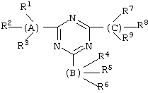 где А, В и С каждый является ароматическим, по крайней мере один из А, В и С замещен гидроксильной группой в ортоположении по отношению к точке присоединения к триазиновому кольцу, и каждый от R1 до R9 выбирают из группы, состоящей из водорода, гидрокси, алкила, алкокси, сульфо, карбокси, галогена, галогеналкила и ациламино.