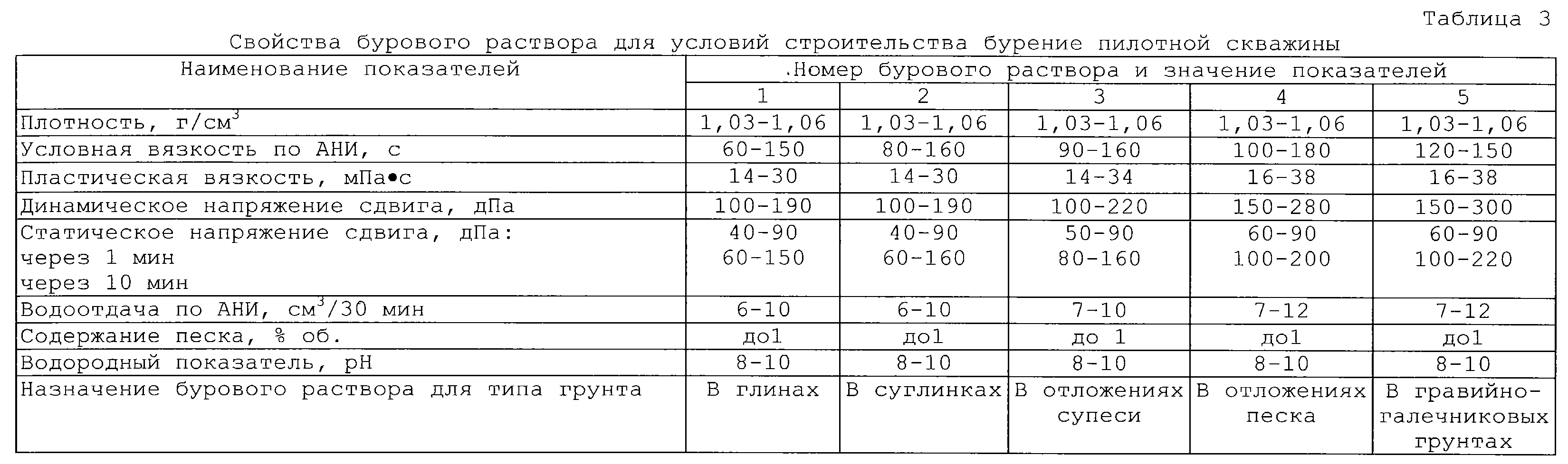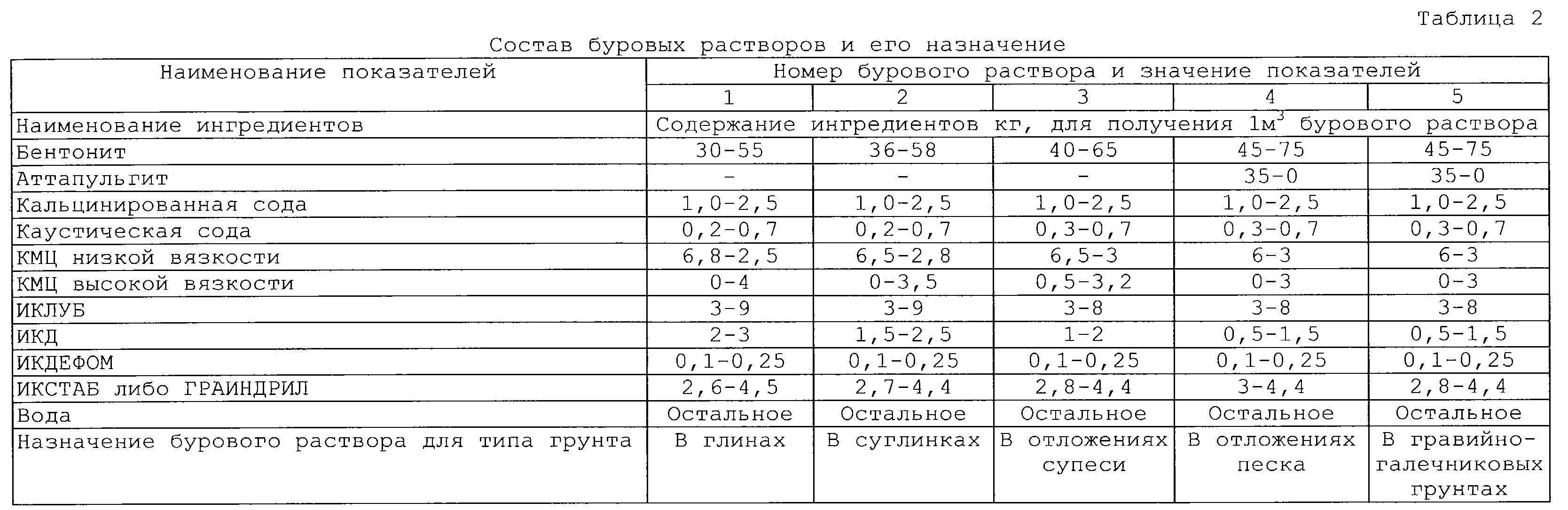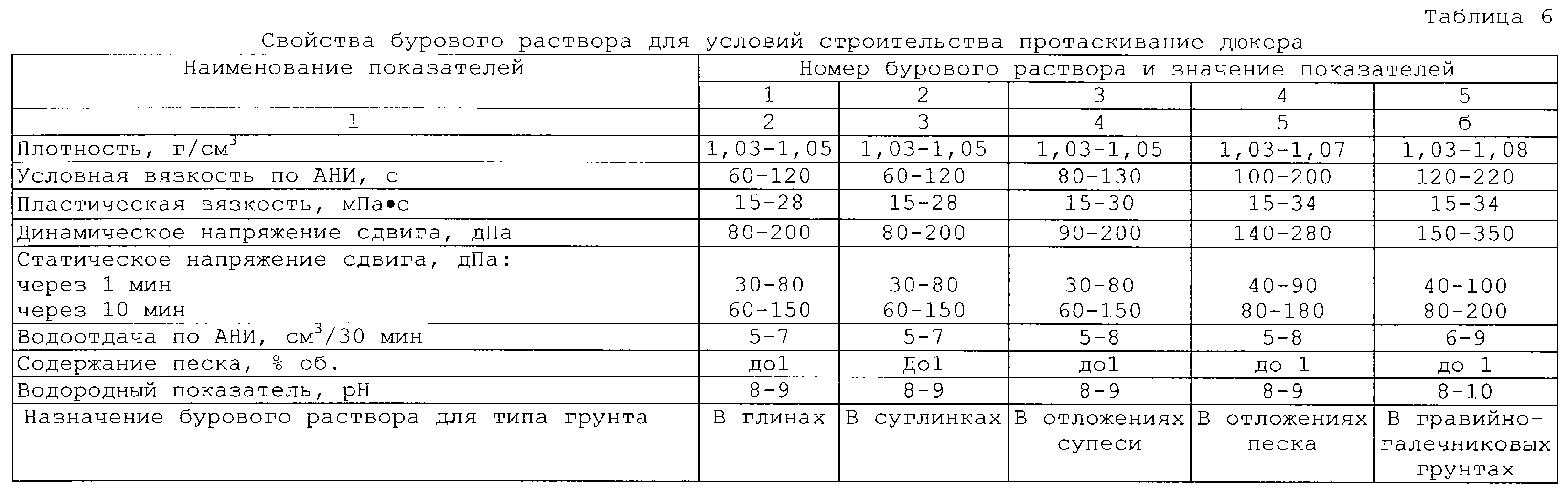 В таблице 1 приведены конкретные примеры состава предлагаемого бурового раствора и количественное соотношение его компонентов. В таблице 2 ингредиенты в достаточном количестве каждый для оказания в композиции влияния на процесс бурения, в зависимости от вида разбуриваемых грунтов: в глинах, в суглинке, в отложениях супеси, в отложениях песка, в гравийно-галечниковых грунтах. В таблицах 3-6 представлены свойства соответствующих буровых растворов с учетом режимов и вида строительства ствола при бурении: проходка пилотной скважины, расширение пилотной скважины, калибрование ствола скважины, протаскивание дюкера. Как видно из таблиц 1-6, наличие в буровом растворе предложенной композиции ингредиентов при их определенном соотношении, включающей анионные либо амфолитные полимерные добавки – полиэлектролиты в виде обратных водомасляных эмульсий, обеспечивает требуемые технологические и реологические свойства получаемых высоковязких полимерно-бентонитовых буровых растворов, для широкого диапазона грунтов, в зависимости от горно-геологических и гидрогеохимических условий строительства, в том числе, строительства переходов наклонно-направленным и горизонтальным бурением, а также водных переходов. Предложенные высоковязкие полимерно-бентонитовые растворы соответствуют государственным санитарно-эпидемиологическим правилам и нормативам ГОСТ 12.1.007-76 ССБТ “Вредные вещества. Классификация и общие требования безопасности”, по параметрам острой токсичности относятся к малоопасным химическим веществам IV класса опасности. ЛД0 – 10000 мг/кг. Слабо раздражает слизистые оболочки глаз. Государственными гигиенической и санитарно-эпидемиологической службами Российской Федерации на данный буровой раствор выданы соответствующие официальные токсиколого-гигиенический паспорт и санитарно-эпидемиологическое заключение на возможность производства, применения (использования) и реализации предлагаемых полимерно-бентонитовых буровых растворов на территории Российской Федерации, для строительства методом наклонно-направленного бурения переходов, в том числе подводных, и бурения скважин всех назначений.