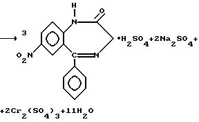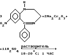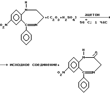 (57) Реферат: Описывается способ получения 1,3-дигидро-7-нитро-5-фенил-2Н-1,4-бензодиазепин-2-она путем взаимодействия 2-хлор-5-нитробензофенона с этилендиамином в среде органического растворителя при нагревании с последующим окислением полученного 2,3-дигидро-7-нитро-5-фенил-1Н-1,4-бензодиазепина соединением шестивалентного хрома в концентрированной серной кислоте в среде растворителя и выделением целевого продукта, при этом взаимодействие-2-хлор-5-нитробензофенона с этилендиамином осуществляют в изопропиловом спирте при 70-80°С, окисление 2,3-дигидро-7-нитро-5-фенил-1Н-1,4-бензодиазепина проводят в среде ацетона или ацетонитрила при 18-20°С насыщенным водным раствором бихромата натрия (калия) при мольном соотношении компонентов 2,3-дигидро-7-нитро-5-фенил-1Н-1,4-бензодиазепин : бихромат натрия (калия) : концентрированная серная кислота : ацетон или ацетонитрил 1 : (0,92-1,02) : (7,5-8,5) : (72-76), а выделение целевого продукта осуществляют отделением осадка от реакционной массы и обработкой последнего в водной среде раствором щелочи до рН 3,0-3,5. Технический результат – повышение технологичности и выхода целевого продукта. 2 c.п. ф-лы, 3 табл. Изобретение относится к органической химии, конкретно к способу получения 1,3-дигидро-7-нитро-5-фенил-2Н-1,4-бензодиазепин-2-она (нитразепама) формулы ![]() Нитразепам (Nitrazepamum) – психотропный лекарственный препарат, он оказывает успокаивающее действие на центральную нервную систему, обладает снотворным действием, вызывает мышечную релаксацию, обладает противосудорожной активностью. Нитразепам относится к лекарственным препаратам из класса 1,4-бензодиазепин-2-онов, которые хорошо известны из уровня техники. Наиболее распространенный способ их получения заключается в синтезе 2-хлор- 5-нитробензофенона, обмене хлора на аминогруппу, получении 2-(2-хлор-ацетамидо-нитробензофенона с последующей его циклизацией с гексаметилентетрамином (a.с. N 550980, кл. C 07 D 243/16; пат. США 4155904, кл. 260-239, oпубл. 1977 г.). Менее распространенным является способ получения 1,4-бензодиазепин-2-онов путем последовательного построения бензодиазепиновой структуры (например, из 2-хлор-5-нитробензофенона) с последующим окислением метиленовой группы до карбонильной. Так, известен способ получения бензодиазепиновых соединений формулы ![]() где R4; R5 и R6 выбраны из группы -H; Hal; CF3; NO2; NH2… (пат. США N 3222359, кл. 540-574, oпубл. 1965 г., авторы Reeder Е., Sternbach L.H.), включающий реакцию соединения формулы ![]() где R4; R5 и R6 указаны выше; R8 – галоген, с соединением формулы ![]() Синтез 2,3-дигидро-7-нитро-5-фенил-1Н-1,4-бензодиазепина (R4 и R6=H, R5= -NO2) осуществляют следующим образом: бензофенон, содержащий галоген в o-положении к C=O группе и активирующий электроотрицательный заместитель в положении 5 обрабатывают этилендиамином в среде пиридина при повышенной температуре (115-117oC). Затем растворитель отгоняют в вакууме, к остатку добавляют метанол, и сырой реакционный продукт отфильтровывают. Выход целевого продукта в патенте не указан. Отмечено только, что добавочное количество продукта можно получить дополнительной обработкой фильтрата, выделив и подвергнув циклизации непрореагировавшие соединения с открытой цепью. Недостатками способа являются трудоемкость выделения конечного продукта (вакуумная отгонка досуха смеси пиридина и этилендиамина, большие потери целевого продукта при высаживании метанолом), зна