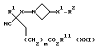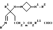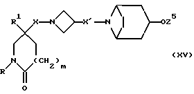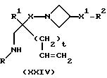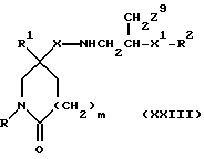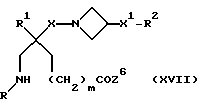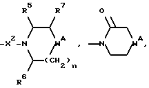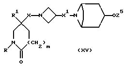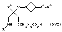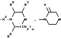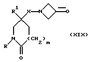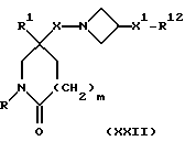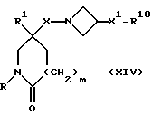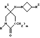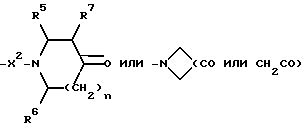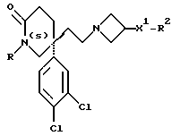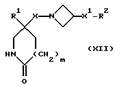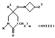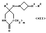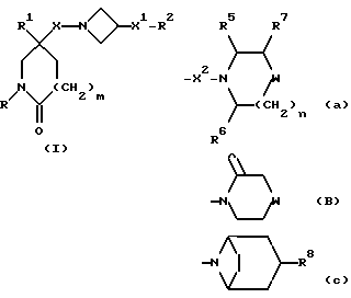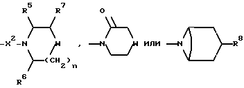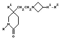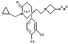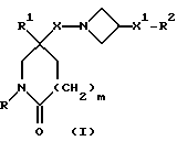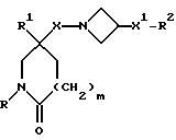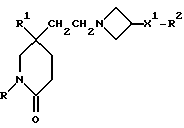 (57) Реферат: Изобретение относится к производным (азетидин-1-илалкил)лактамов формулы (I) и их фармацевтически приемлемым солям, где R – (C1-C6)-алкил, необязательно замещенный -COOH, -COO((C1-C4)-алкилом), (C3-C7)-циклоалкилом, арилом или гет1, и (C3-C7)-циклоалкил, необязательно замещенный 1-2 заместителями, выбранными из (C1-C4)-алкила и фтора; R1 – фенил, необязательно замещенный 1-2 галозаместителями; R2 – -CONR3R4, -CONR5((C3-C7)-циклоалкил), -NR3R4, гет3 или группа формул (а), (в), (с); X – (C1-C4)-алкилен; X1 – направленная связь, X2 – направленная связь или CO; m = 1; используемых при лечении заболеваний посредством продуцирования антагонистического действия на тахикинин, действующий в человеческом NK1-, NK2– и NK3-рецепторе или в их сочетаниях. Предложены также промежуточные соединения, используемые при их получении, фармацевтическая композиция и способ лечения. 4 с. и 11 з.п.ф-лы, 29 табл.