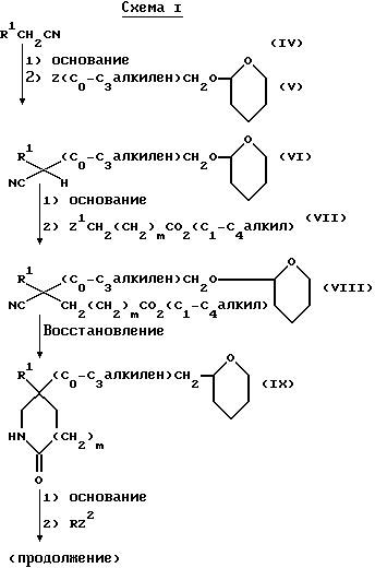 Препаративный пример 35-(3,4-Дихлорфенил)-5-(2-[тетрагидропиран-2-ил-окси] этил)-2(1Н)- пиперидон Соединение препаративного примера 2 (18,7 г, 45,2 моль) растворяют в насыщенном этанольном растворе аммиака (500 мл), который содержит никель Ренея (3,5 г). Смесь перемешивают в атмосфере водорода при атмосферном давлении в течение 7 часов. Затем катализатор удаляют фильтрацией, этанол удаляют при пониженном давлении, и остаток хроматографируют, используя силикагель, элюируя сначала диэтиловым эфиром, а затем метанолом с дихлорметаном (1 : 9, по объему). Получают названное в заголовке соединение (10,4 г). ТХС Rf = 0,45 (диоксид кремния, метанол : дихлорметан, 1 : 9, по объему). МСНР m/z = 372 (m+1)+. 1H ЯМР (CDCl3): = 1,4 – 1,8 (м, 6H), 1,9 – 2,1 (м, 5H), 2,3 – 2,45 (м, 1H), 3,0 – 3,2 (м, 1H), 3,0 – 3,2 (м, 1H), 3,35 – 3,85 (м, 4Н), 4,35 – 4,4 (м, 1H), 6,05 (с, ш, 1Н), 7,15 – 7,45 (м, 3Н) ppm.