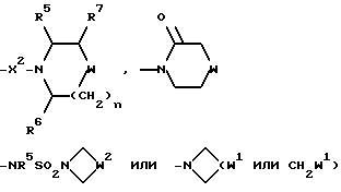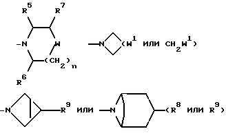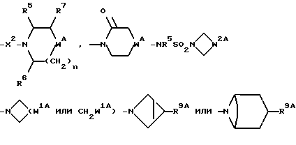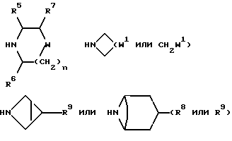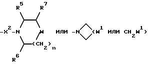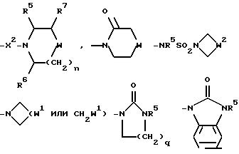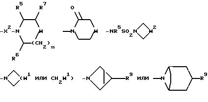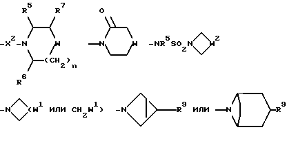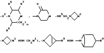 Примеры со 2 по 59Соединения общей формулы: ![]() примеров, перечисленных ниже в табл. 1, получают способом, подобным способу примера 1, используя в качестве исходных веществ соответствующий альдегид (см. препаративные примеры 39-43, 137-140 и 187-191) и азетидин (см. препаративные примеры 56, 61, 65, 66, 67, 70, 77-80, 82, 84, 85, 87, 89, 107-118, 121, 134, 154, 180 и 181). Подстрочные примечания 1. Используют по крайней мере 2 мол. экв. триэтиламина. 2. Другой способ получения см. в примере 103. 3. При реакции в качестве сорастворителя используют дихлорэтан. 4. Дигидрохлорид 3-(1H-имидазол-1-ил) азетидина, используемый в качестве исходного вещества, получают путем обработки 1-(третбутоксикарбонил)-3-(1H-имдазол-1-ил)азетидина хлористым водородом в дихлорметане по способу, описанному в публикации международного патента N ВОИС 93/19059. 5. Получают (S)-энантиомер. 6. Чтобы довести реакцию до конца, позднее добавляют дополнительные количества исходного азетидина (приблизит. 1 мол. экв. ), триэтиламина (приблизит. 2 мол. экв.) и тетрагидрофурана, после чего добавляют триацетоксиборогидрид натрия (приблизит. 1,5 мол. экв.) и ледяную уксусную кислоту. В качестве элюента для колонки используют метанол с дихлорметаном. 7. Осуществляют элюирование с градиентом, используя в качестве элюента дихлорметан, а затем дихлорметан с метанолом. 8. Элюирование с градиентом осуществляют, используя сначала в качестве элюента этилацетат, а затем этилацетат с метанолом, и на последних стадиях эту смесь заменяют на смесь дихлорметана с метанолом. 9. В качестве исходного вещества используют бистрифторацетат 3-(4-аминосульфонилпиперазин-1-ил)азетидина (см. препаративный пример 154). 10. Сырой продукт реакции очищают в виде соли трифторуксусной кислоты посредством хроматографии на силикагеле, элюируя смесью дихлорметана с метанолом и 0,880 водным раствором аммиака (89:10:1, по объему). Очищенную соль обрабатывают 10% водным раствором карбоната калия, и водный слой несколько раз экстрагируют этилацетатом. Объединенные органические слои сушат (Na2SO4) и концентрируют при пониженном давлении, и получают нужный продукт. 11. Очищают хроматографией с обращенной фазой, используя гель MCI (торговая марка) (высокопористый полистирол CHP 20P [75-150 мкм]), используя в качестве элюента метанол, а затем метанол с водой. 12. Получают (R)-энантиомер. 13. В качестве исходного вещества используют дитрифторацетат азетидина. 14. Пример только для сравнения. 15. В качестве исходного вещества используют дигидрохлорид азетидина. 16. Элюирование с градиентом осуществляют, используя в качестве элюента дихлорметан, а затем дихлорметан с метанолом и концентрированным водным раствором аммиака. 17. [ ]2D5 +48,9o (c = 0,0009 в метаноле).