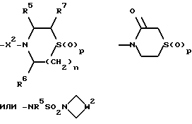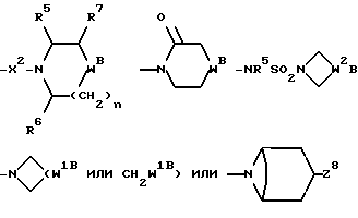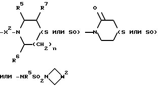 ![]() или их фармацевтически приемлемые соли, где R – (C1 – C6)-алкил, необязательно замещенный COOH, -COO((C1 – C4)-алкилом), (C3 – C7)-циклоалкилом, арилом или Гет1, и (C3 – C7)-циклоалкил, необязательно замещенный 1 или 2 заместителями, каждый из которых выбирается независимо из (C1 – C4)-алкила и фтора; R1 – фенил, необязательно замещенный 1 или 2 галозаместителями; R2 – -CONR3R4, -CONR5(C3 – C7-циклоалкил), -NR3R4, Гет3 или группа формулы ![]() или ![]() R3 и R4 – каждый и независимо выбирается среди H и (C1 – C4)-алкила, (C1 – C4)-алкила, замещенного гидроксильной группой или (C1 – C4)-алкоксигруппой; R5 и R6 каждый и независимо выбирается среди H, (C1 – C4)-алкила, необязательно замещенного фтором, и (C3 – C7)-циклоалкил-(C1 – C4)-алкила; R7 – H, гидроксильная группа или фенил; R8 – гидроксильная группа или (C2 – C5)-алканоилоксигруппа; X – (C1 – C4)-алкилен; X1 – направленная связь; X2 – направленная связь или CO; W – метилен, CH((C1 – C4)-алкоксигруппа), CHCO2H, CHCO2((C1 – C4)-алкил), CH(бензоксазол-2-ил), CHNR5R6, CHNR5COR5, CHNR5(SO2 C1 – C4 алкил), CHNR5COO(C1 – C4 алкил), O, S(O)p, NR5, NSO2 (C1 – C4 алкил), NSO2NR5R6, NSO2 (морфолино)группа, CH(OH), NCONR5R6, NCOR5, NCO(арил) или NCO2((C1 – C4)-алкил); m = 1; n = 1 или 2, когда W является иным, чем метилен, и n = 0 или 1, когда W – метилен; p = 0, 1 или 2; термин “арил”, использованный при определении R, W означает фенил, необязательно замещенный 1 или 2 заместителями, независимо выбранными из (C1 – C4)-алкила, галогена, -OR5, фтор (C1 – C4)-алкила, (C2 – C5)-алканоила, -SO2NR5R6 или фенила; термин “Гет1“, использованный при определении R, означает 5- или 6-членную циклическую гетероарильную группу, содержащую либо 1, либо 2 гетероатома азота; термин “Гет3“, использованный при определении R2, означает N-связанную 5-членную циклическую гетероарильную группу, содержащую 1 или 2 гетероатомов азота. 2. Соединение по п.1, где R – (C1 – C6)-алкил, необязательно замещенный -COOH, -COO((C1 – C4)-алкилом), (C3 – C7)-циклоалкилом, арилом или Гет1, причем упомянутый циклоалкил необязательно замещен 1 или 2 заместителями, каждый из которых независимо выбирают среди (C1 – C4)-алкила и фтора; R1 – фенил, необязательно замещенный 1 или 2 галогенными заместителями; R2 – -CONR3R4, -CONR5((C3 – C7)-циклоалкил), -NR3R4, Гет3 или группа формулы ![]() где R3 и R4 каждый и независимо выбирают среди (C1 – C4)-алкила и (C1 – C4)-алкила, замещенного гидроксильной группой или (C1 – C4)-алкоксигруппой; R5 и R6 каждый и независимо выбирают среди H, (C1 – C4)-алкила, необязательно замещенного фтором, и (C3 – C7)-циклоалкил-(C1 – C4)-алкила; R7 – H, гидроксильная группа или фенил; R8 – гидроксильная группа или (C2 – C5)-алканоилоксигруппа; W – метилен, CH(OH), CH((C1 – C4)-алкоксигруппа), CHCO2H, CHCO2((C1 – C4)алкил), CH(бензоксазол-2-ил), CHNR5R6, CHNR5COR5, CHNR5(SO2(C1 – C4)-алкил), CHNR5 COO (C1 – C4)-алкил), O, S(O)p, NR5, NSO2(C1 – C4)-алкил), NSO2NR5R6, NSO2(морфолиногруппа), NCONR5R6, NCOR5, NCO(арил) или NCO2((C1 – C4)-алкил); n = 1 или 2, когда W является иным, чем метилен, и n = 0 или 1, когда W представляет собой метилен, и p = 0, 1 или 2; и X, X1, X2, m, арил, Гет1 и Гет3 имеют значения по п.1. 3. Соединение по п.2, где R – (C1 – C6)-алкил, необязательно замещенный -COOH, -COO((C1 – C4)-алкилом), (C3 – C7)-циклоалкилом, необязательно замещенным 1 или 2 заместителями, каждый из которых независимо выбирается среди (C1 – C4)-алкила и фтора, фенилом, необязательно замещенным 1 или 2 заместителями, каждый из которых независимо выбирается среди (C1 – C4)-алкила, галогена, (C1 – C4)-алкоксигруппы, фтор(C1 – C4)-алкила, (C2 – C5)-алканоила, -SO2N((C1 – C4)-алкил)2 и фенила, или 5- или 6-членная гетероарильная группа, содер